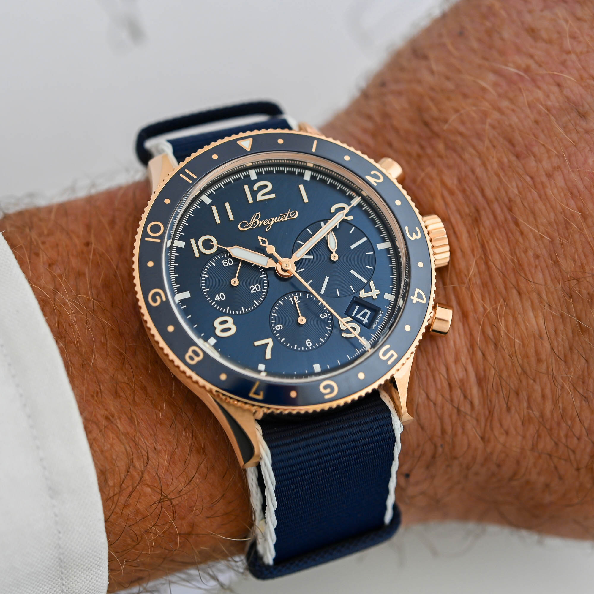 The gold Breguet Type XX comes with a blue alligator strap, equipped with a practical interchangeability system. And if you want to give an even sportier look to your watch, Breguet includes a blue and white textile NATO strap. It’ll be part of the permanent collection and priced at CHF 35,000.