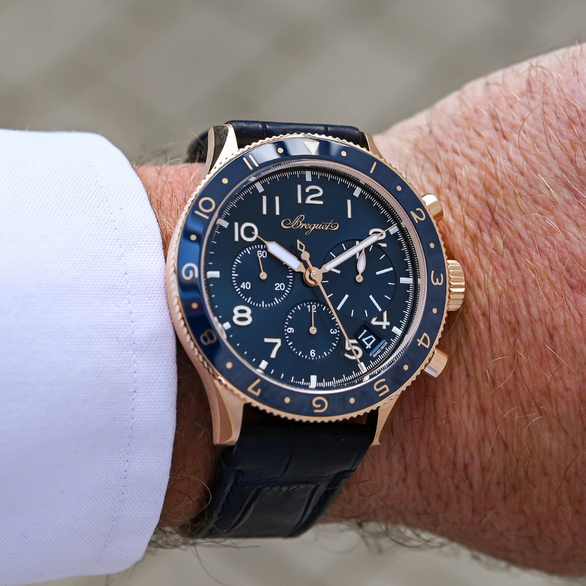The main evolution concerns the dial. While the steel models came with a black dial focused on contrast and legibility, the gold Breguet Type XX adds more reflections and depth with its deep blue colour, a sunray brushed finish and contrasting gold elements. The numerals, still luminous, are now applied and so is the Breguet logo. The hands are gold-coloured too but have a new syringe shape. the sub-dials are recessed with a snailed pattern. The oversized minute counter has been kept too, and so does the date window at 4:30 – I must admit, it’s less disturbing on this gold model.