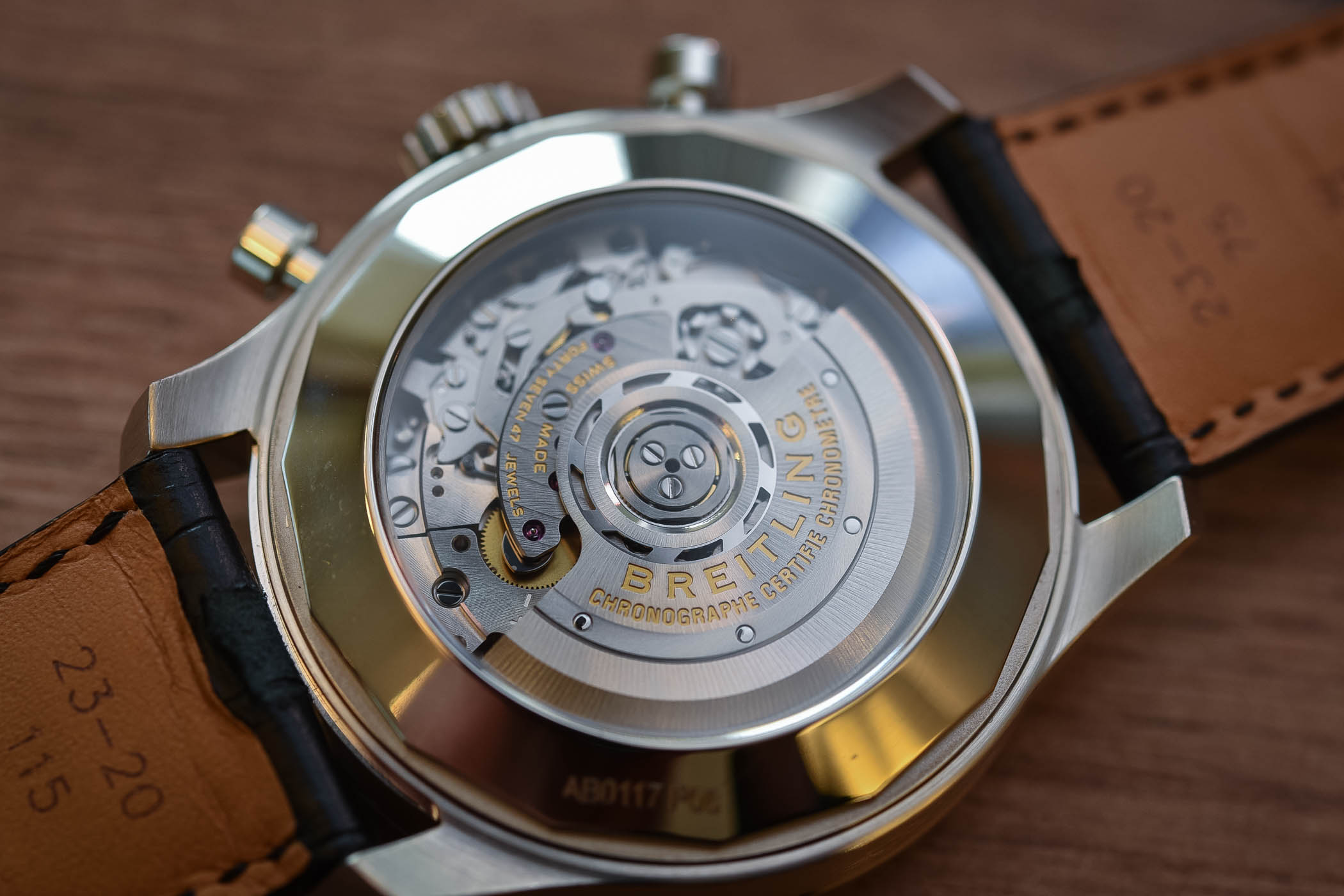 Inside the case of the Navitimer 8, there are no surprises. We find the efficient, modern and well-tested B01 movement. This in-house calibre is an integrated chronograph, with column-wheel and vertical clutch, a modern and technically interesting combination that is used for high-end movements. The 70-hour power reserve is comfortable and calibre B01 is, as always with Breitling, COSC-certified. The movement is visible through the sapphire case back and is pleasantly finished, with Geneva stripes, perlage, and polished bevels.