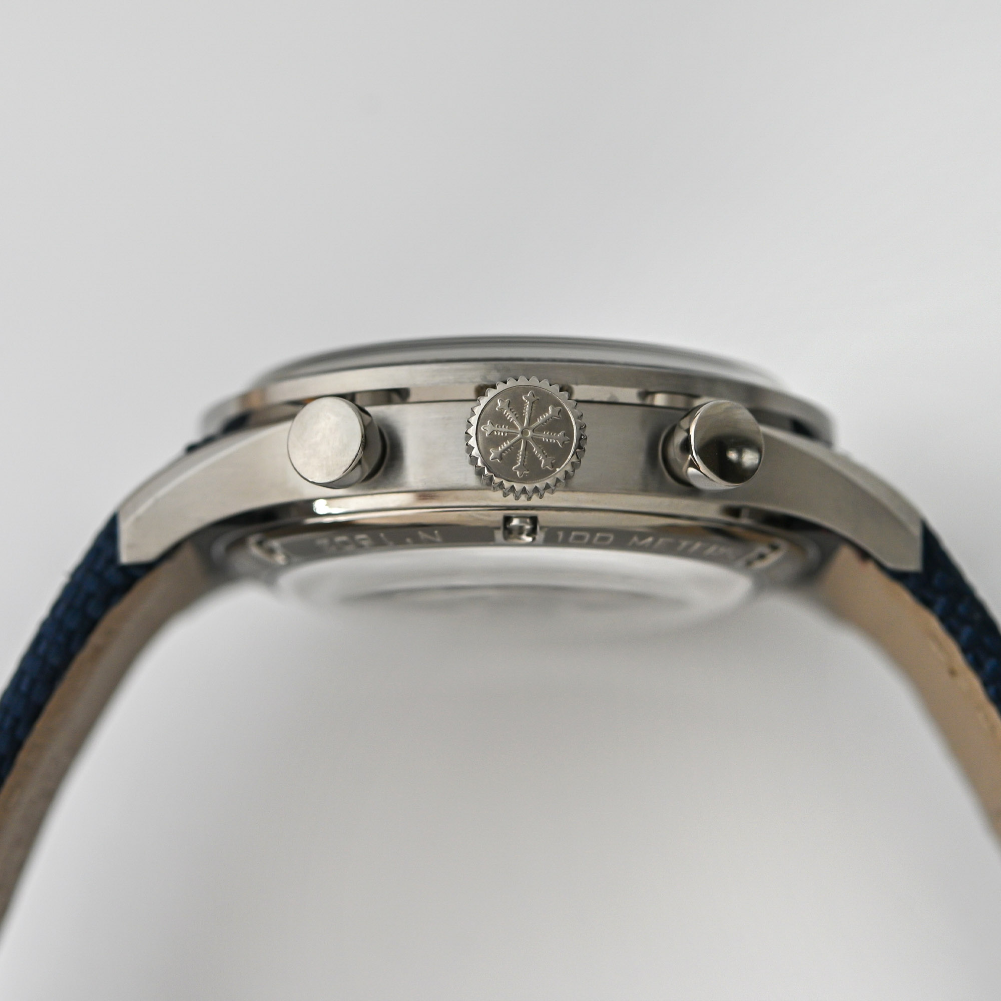 In addition to the titanium case, the new Pandial introduces an original colour scheme with a striking blue dial with contrasting black subdials. The bi-compax layout includes a small seconds indicator at 9 o’clock and a chronograph 30-minute counter at 3 o’clock, while the date is displayed at 6 o’clock. The multi-level construction creates an interesting sense of depth that is further enhanced by the different finishes. In particular, the centre part of the dial features a wave pattern. The diamond-cut applied indexes and hands are coated with Superluminova, ensuring enhanced visibility in the dark. Last, complementing the aluminium tachymeter bezel, a telemeter scale is transferred to the flange at the periphery of the dial.