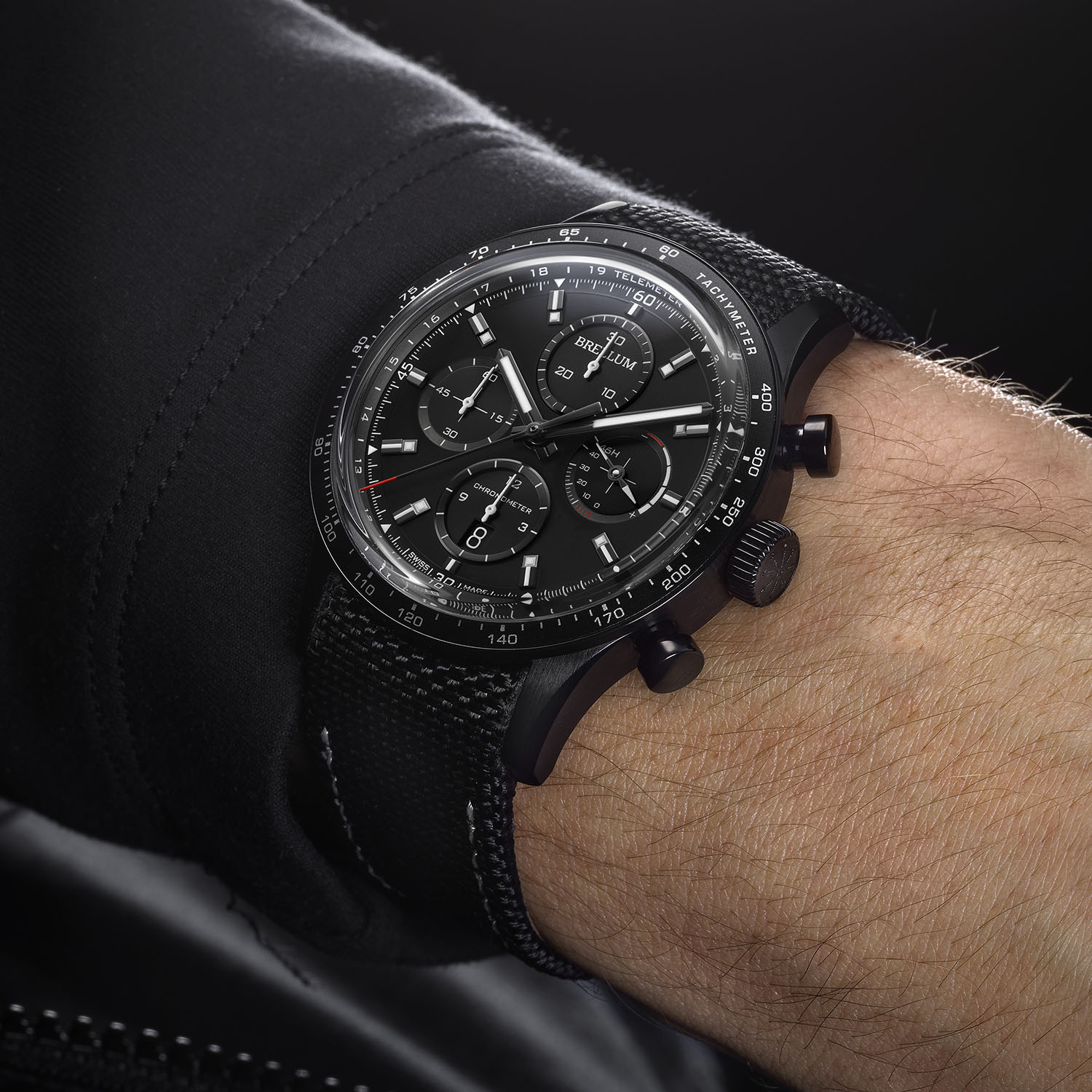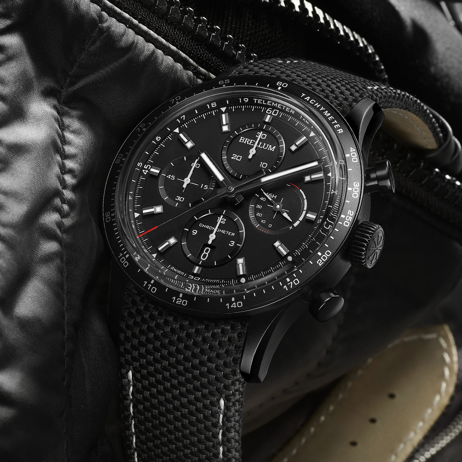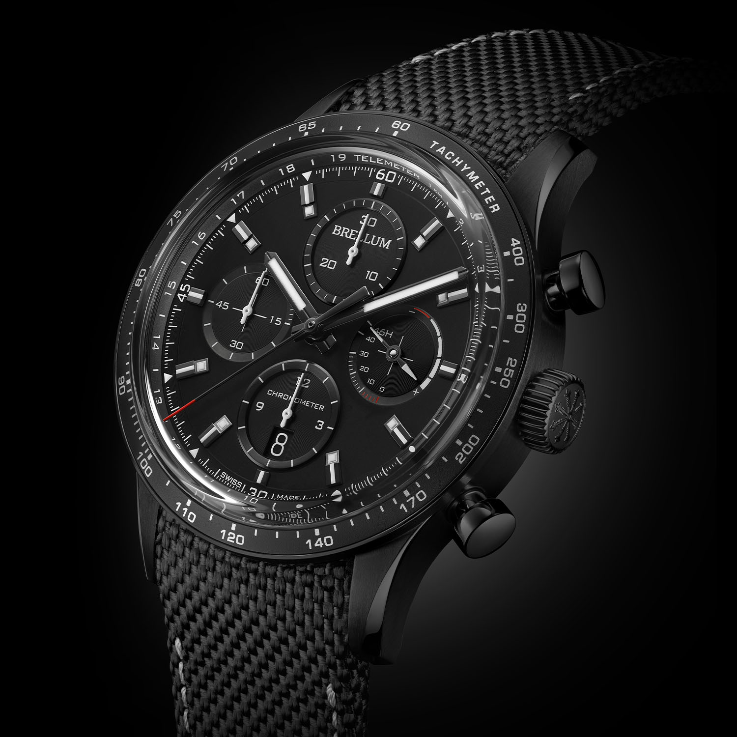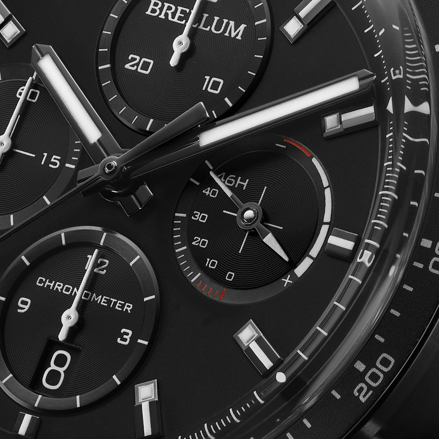 This latest release provides Brellum’s sport-chronograph with a Grade 5 titanium case coated in black DLC, exuding strength, delivering corrosion resistance, and a 40% weight reduction compared to steel. Measuring 43mm in diameter and 11.7mm in thickness (15.9mm including the dual box crystals), it retains Brellum’s hallmark Duobox construction: box-shaped sapphire crystals front and back with multiple anti-reflective coatings to maximise legibility. The watch weighs only 72 grams and remains water-resistant to 100m.