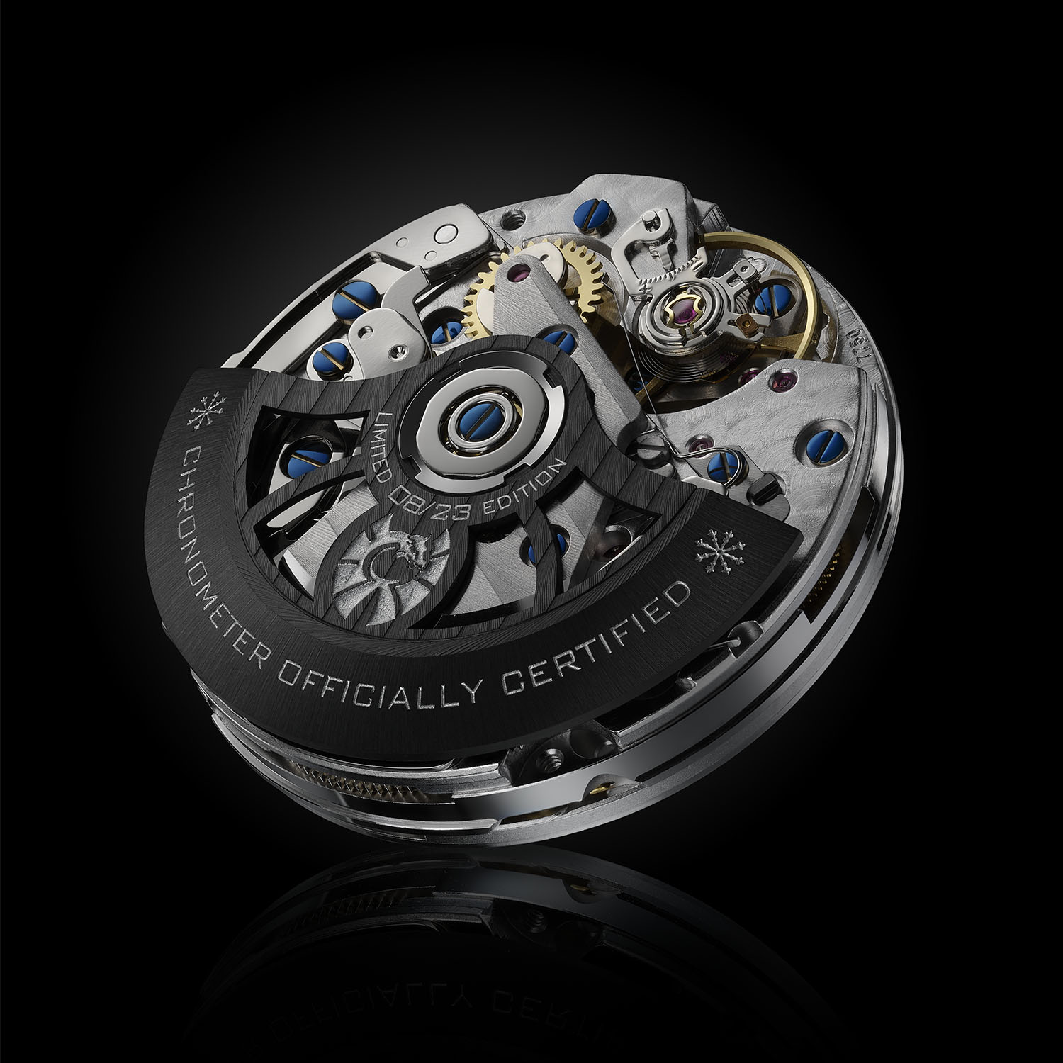 The multi-level black dial is quite detailed yet organised. Polished, diamond-cut hands and applied indexes are filled with Super-LumiNova, ensuring clarity in all lighting conditions. Four subdials deliver full functionality: a 12-hour chronograph counter at 6 o’clock, a 30-minute counter at 12, running seconds at 9, and a power reserve indicator at 3. A tachymeter on the aluminium bezel and a telemeter scale on the flange around the dial provide complete timing instrumentation, while a discreet date display sits within the hour totaliser. Very subtle red accents contribute to the powerful appearance.