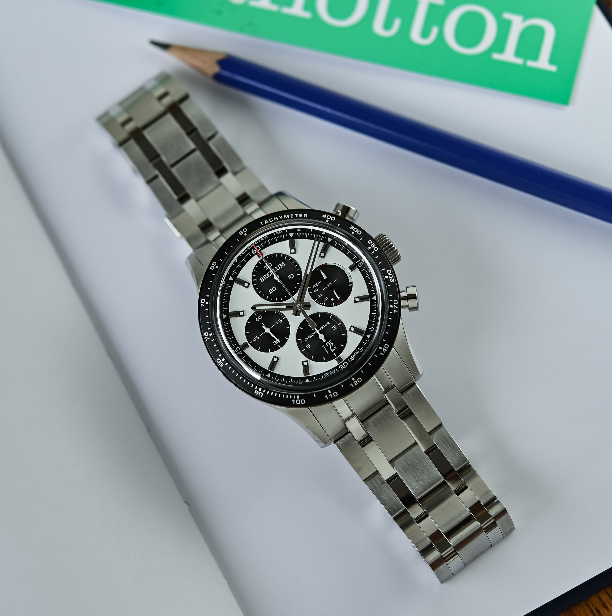 The multi-level panda dial is about contrast and order, with four deep black recessed registers, a 12-hour chronograph counter at 6 o´clock, a running seconds at 9, a 30-minute chrono counter at 12, and a power reserve indicator at 3, all against a bright main plane, framed by a crisp minutes track. The central chronograph seconds hand boasts a red tip, which makes it immediately noticeable against the black-and-white background. The telemeter on the dial´s flange complements the tachymeter on the bezel, timing the event and reading distance by sound. Super-LumiNova on hands and applied diamond-cut indices provide low-light legibility. The date is integrated into the hours totaliser to avoid crowding, and the text logo has been migrated to grace the subdial at 12.