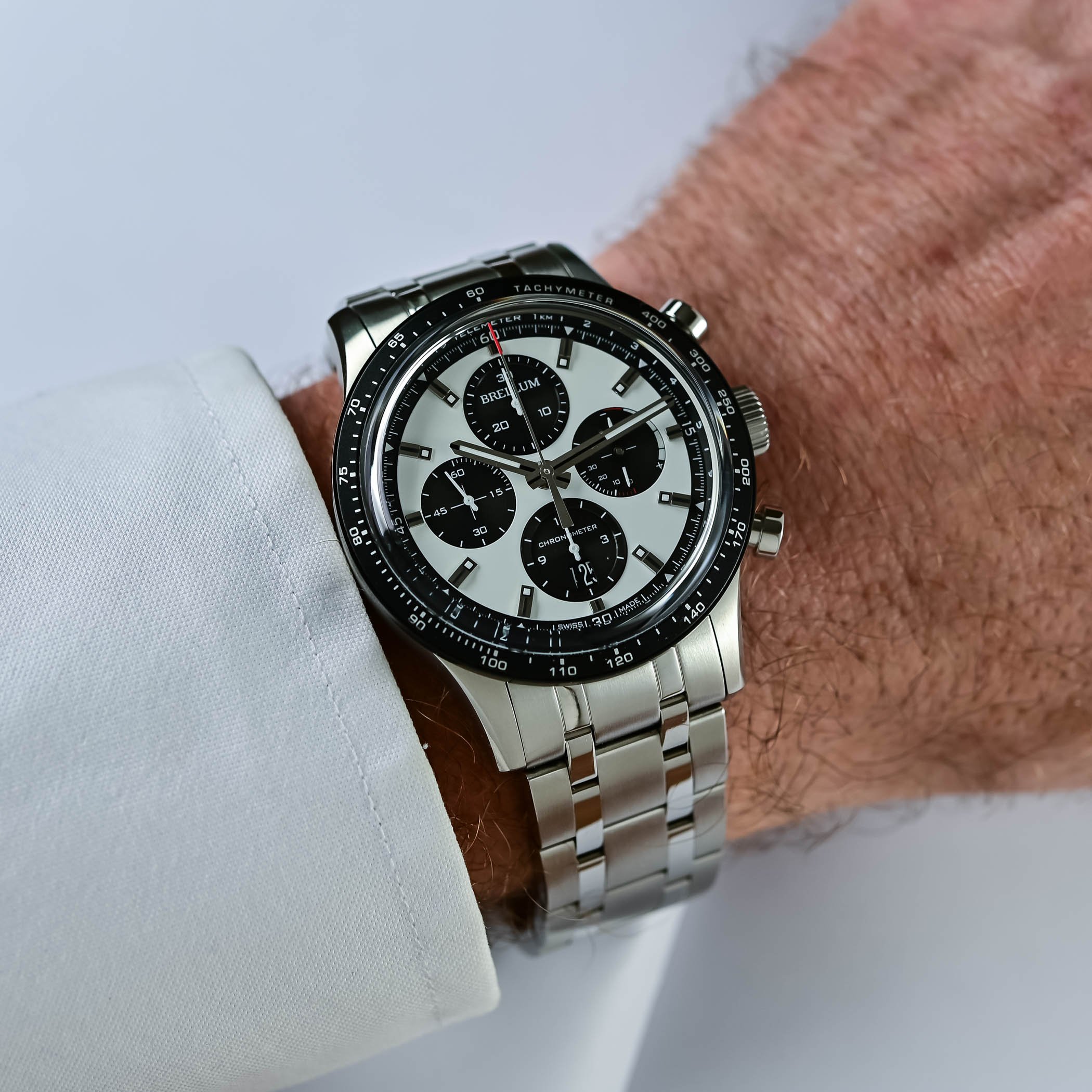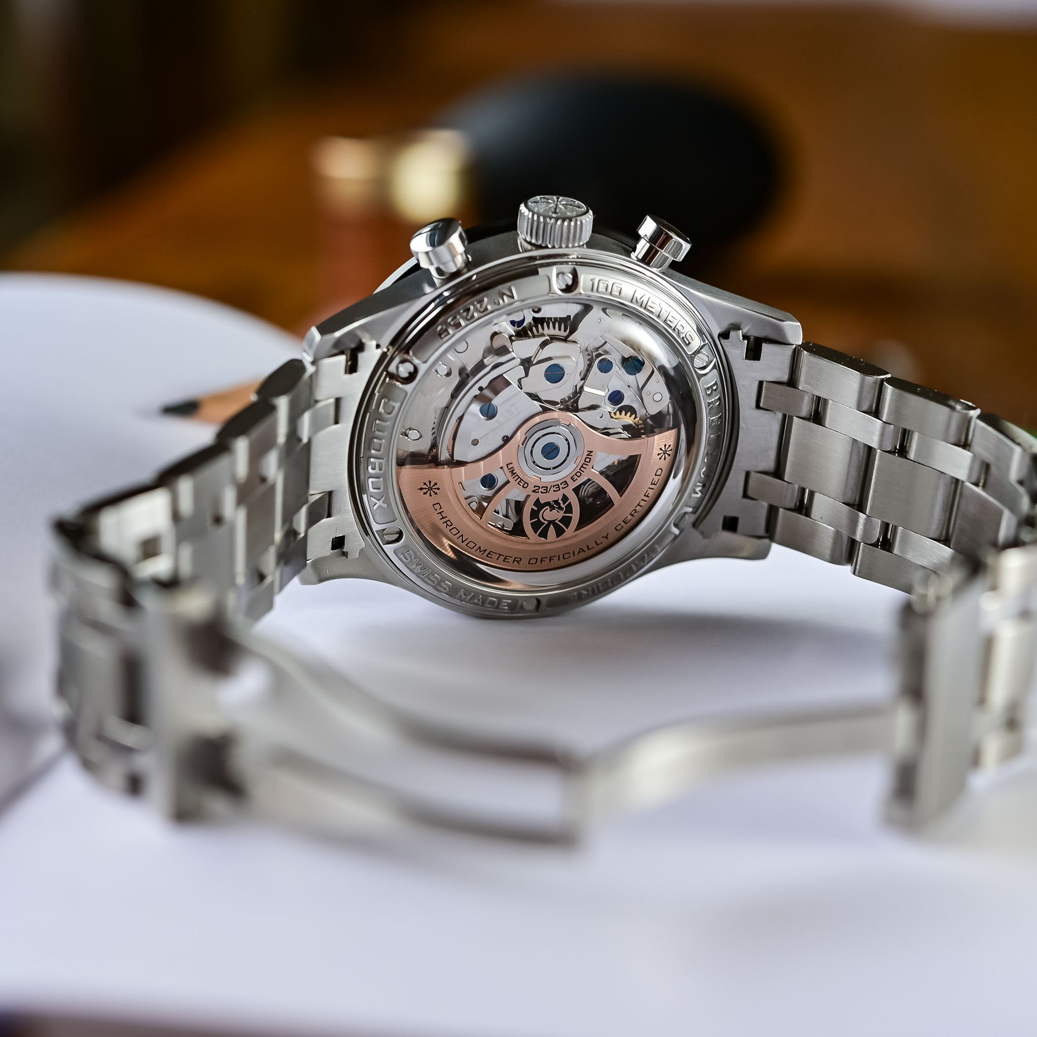 The watch is powered by the BR-750RM, a Valjoux 7750-based automatic movement tuned and finished to Brellum’s usual standard with perlage, Geneva stripes, blued screws, and a gold-coated rotor visible under the domed back. It’s COSC-certified, operates at 28,800 vibrations/hour, and delivers 46 hours of autonomy. Functions are straightforward, and pushers have a positive, familiar 7750 feel.