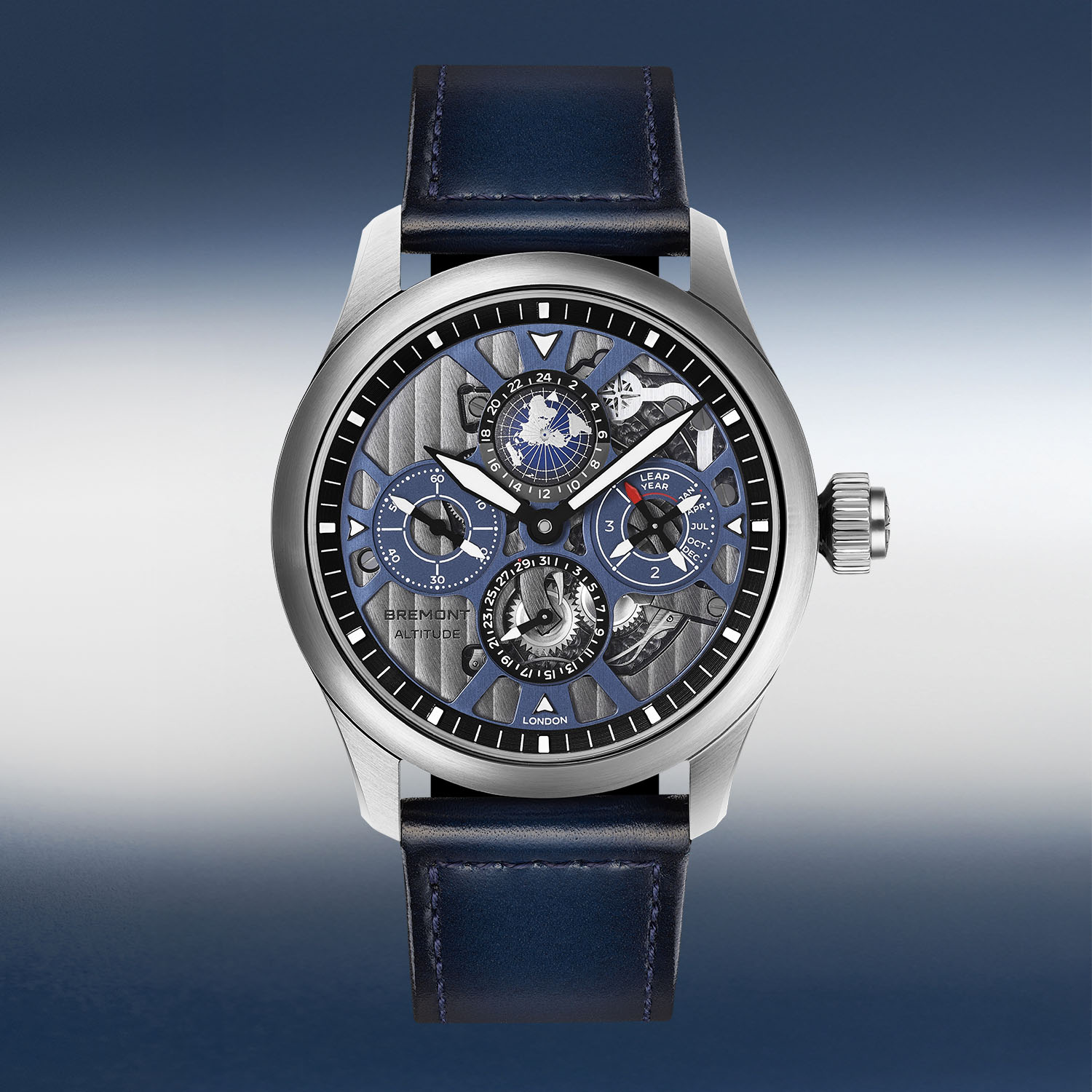 The Skeletonised Altitude Perpetual Calendar GMT Mono-Pusher is delivered with a quick-release titanium bracelet and a quick-release blue patina leather strap. Price is GBP 37,000, and the watch is available through Bremont and authorised retailers. For more information, please visit Bremont.com.