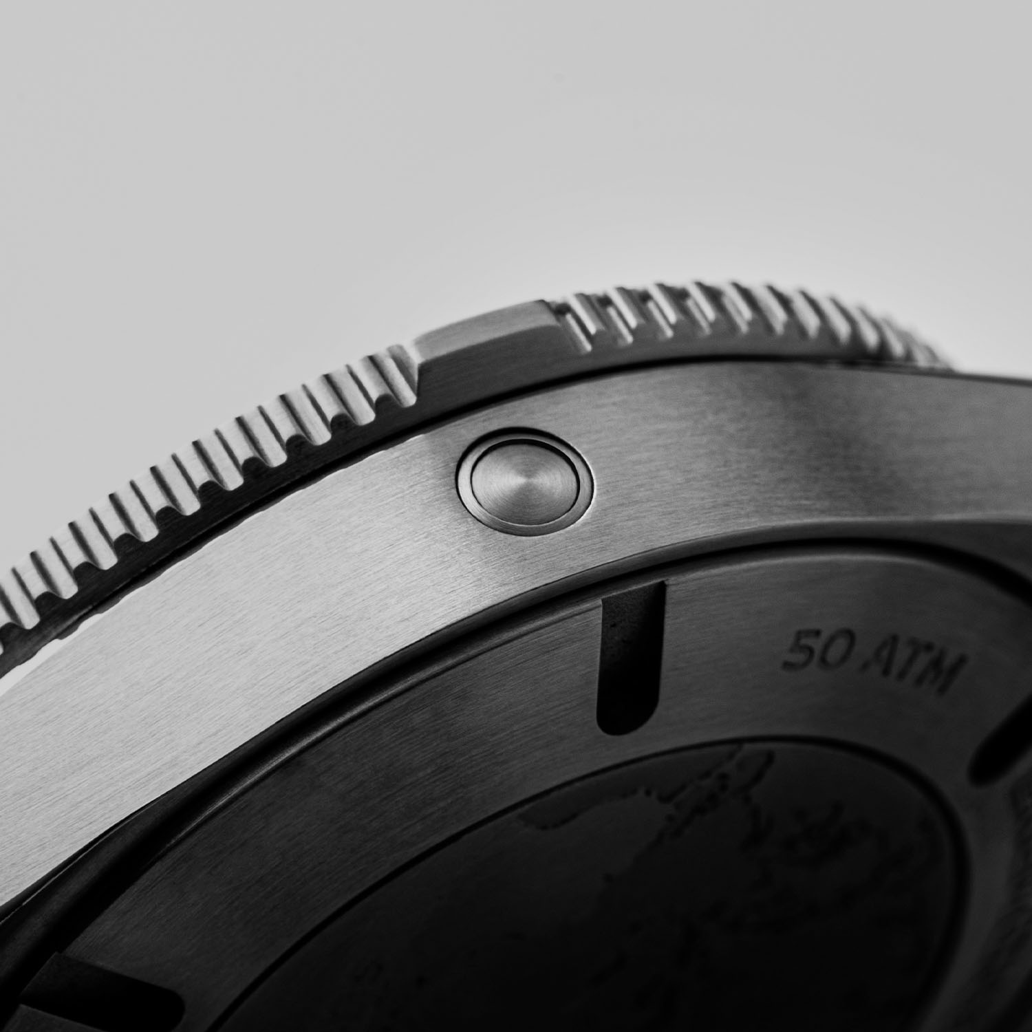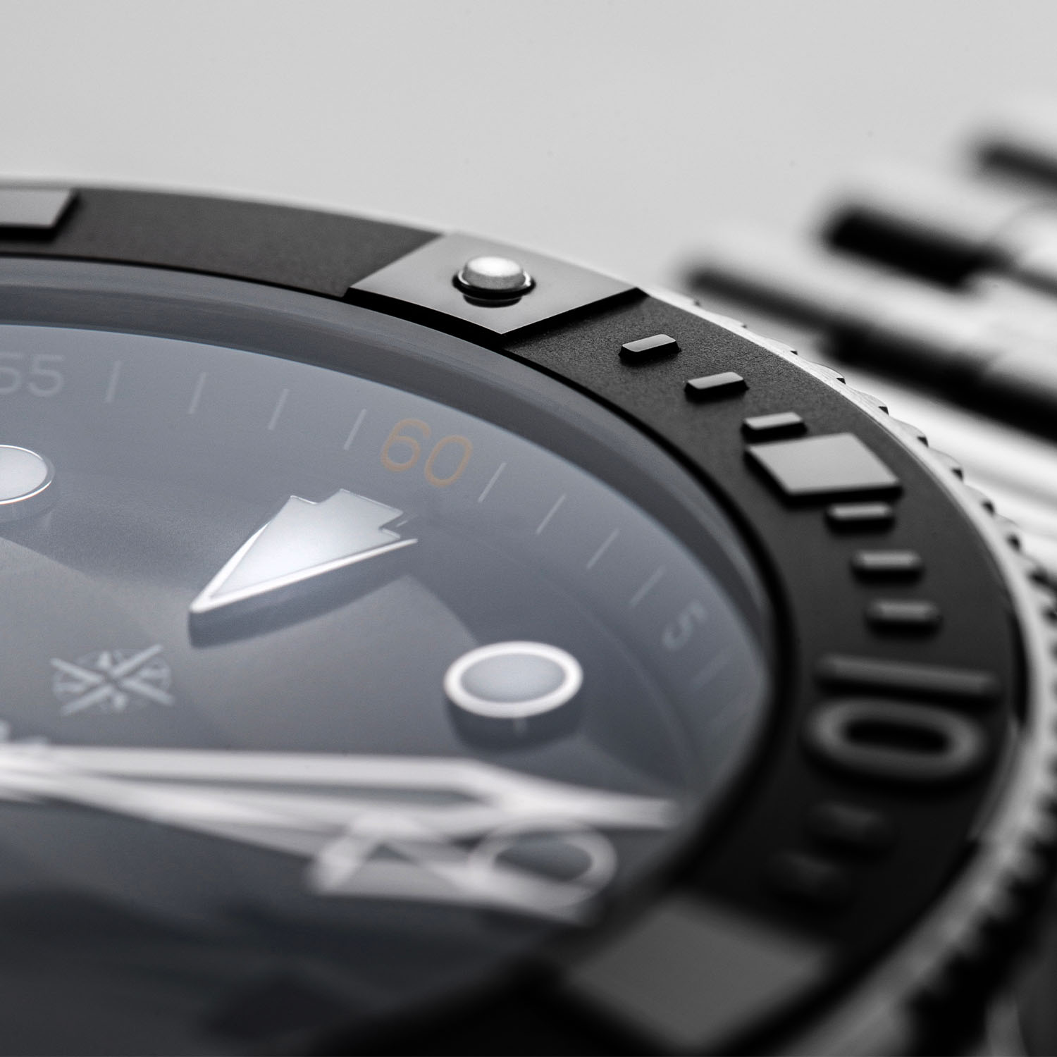 The novelty here is the new 3D black wave design on the dial. Unlike the regular-spaced waves of the Omega Seamaster, the undulating waves on the Supermarine are wider and more organic-looking, almost like the natural ridges produced in seabed sand. Legibility is ensured thanks to the application of Super-LumiNova on the sword-shaped hands and applied indices. An unobtrusive date window at 3 o’clock with a black background completes the functions. The only touch of colour is orange used to highlight the minute markers at 60, 15 and 45, as well as the ‘London’ at 6 o’clock and ‘Supermarine’.