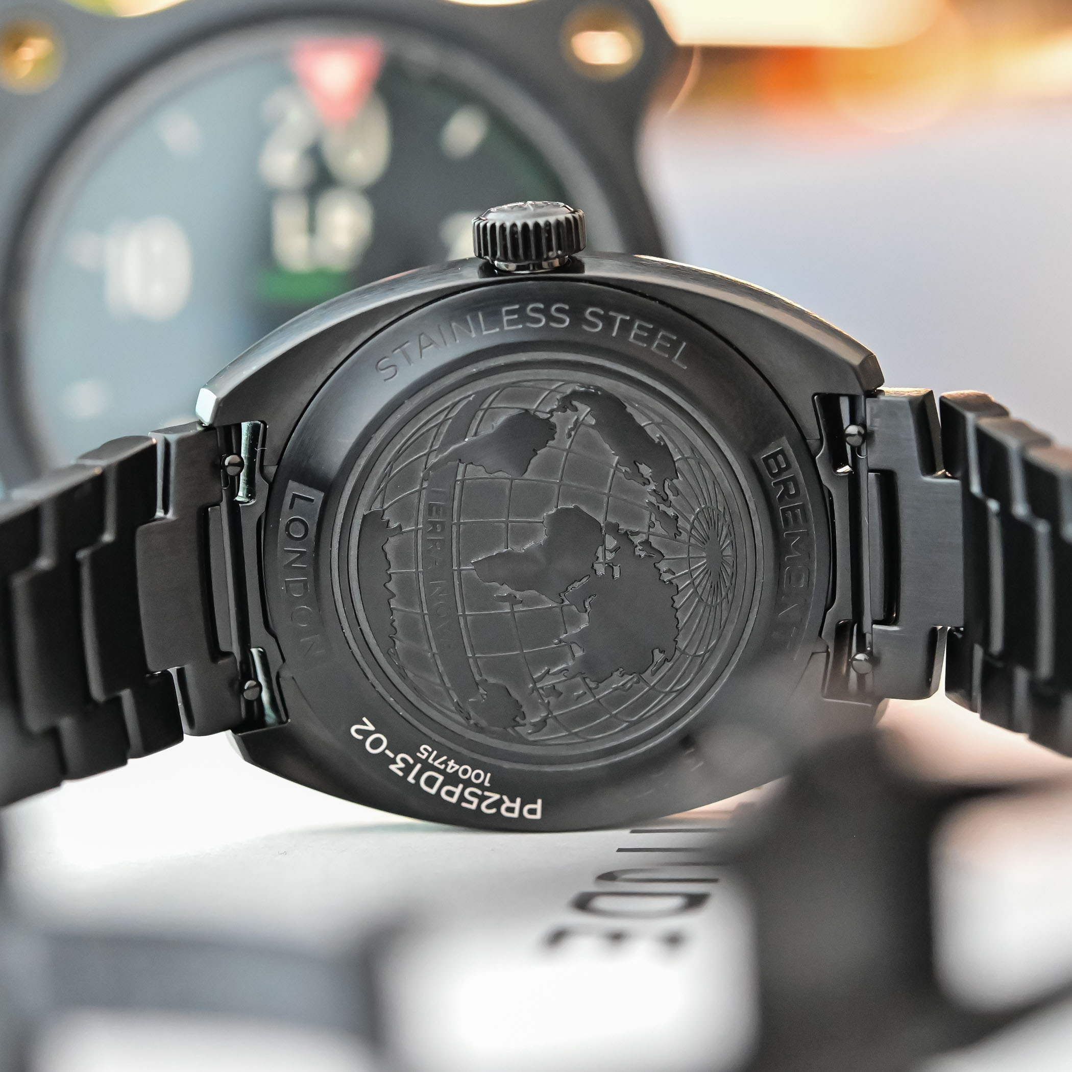 Sharing the cushion-shaped case of the Terra Nova family, the new 38mm steel model, measuring 9.1mm in height, is sheathed in a full-black DLC coating. In line with its commando personality, the case and bracelet are decorated with a predominance of matte brushed surfaces. The closed caseback, decorated with a map of the world, might lead you to believe that the watch can take more than a splash. However, the depth rating is just 30 metres, which is disappointing for a rugged field watch.