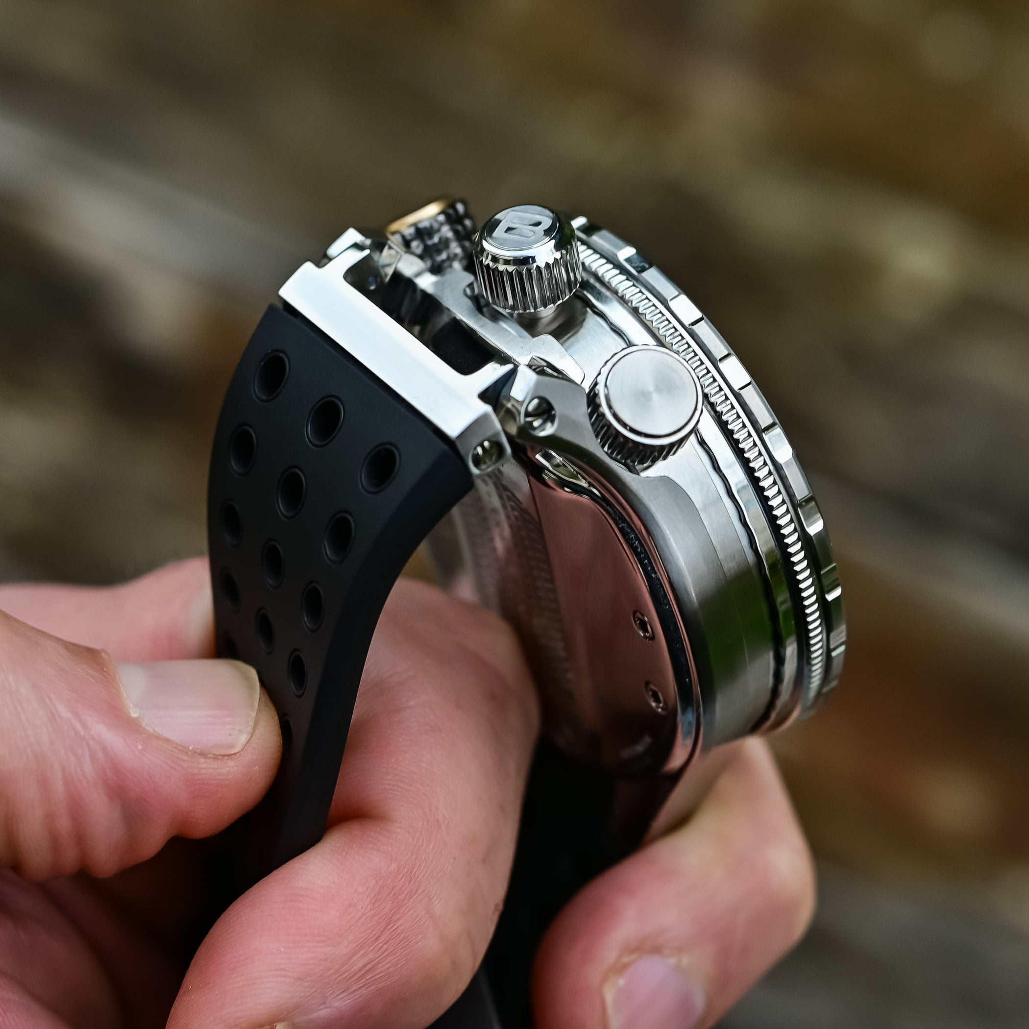 Before diving (pun intended) into the watch-specific functionalities, the first thing that grabs your attention with the Bühlmann Decompression 02 is its technical look and commanding presence. Its distinctive three-crown case design is somehow reminiscent of 1970s bullhead chronographs. Constructed from stainless steel, it has a weighty, tank-like presence on the wrist. And at 48.5mm in diameter, it’s certainly not for the faint of heart. This isn’t a watch designed for the yacht club, but to match your diving suit.