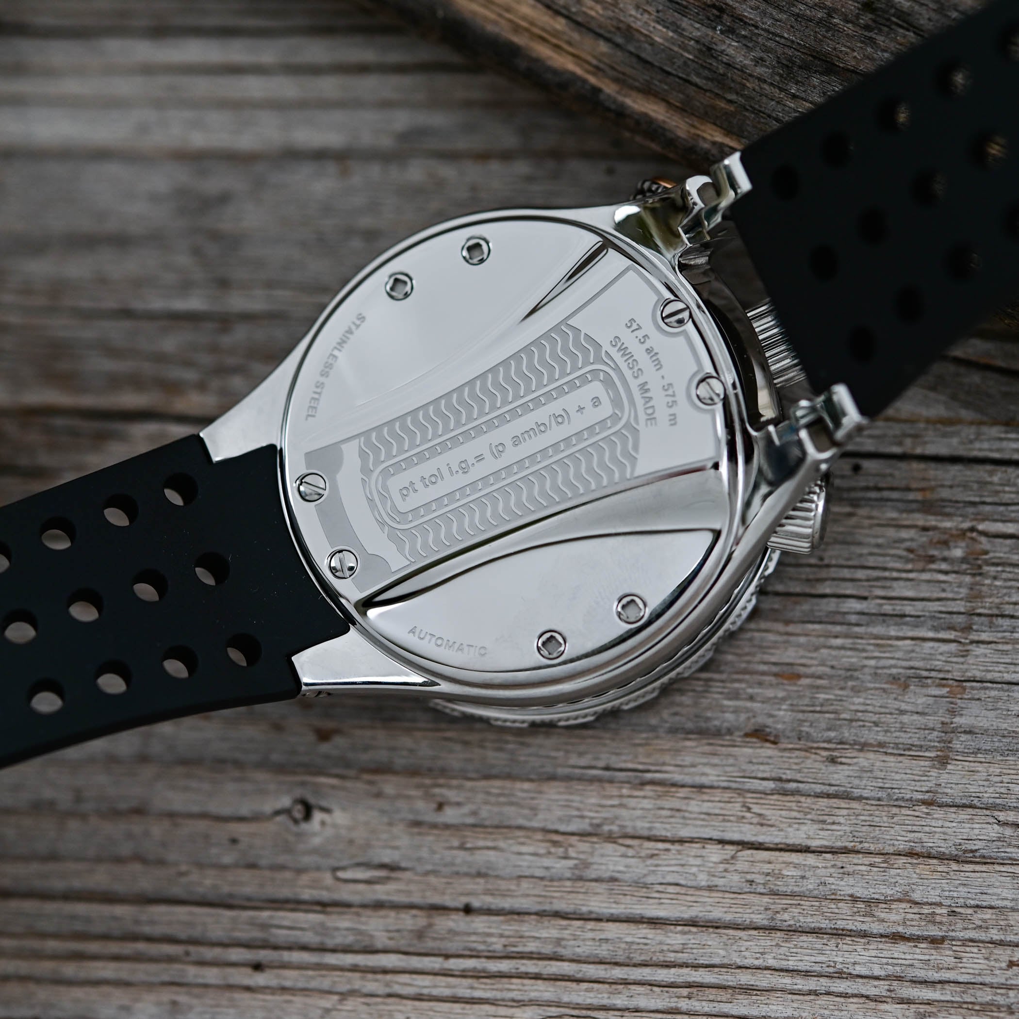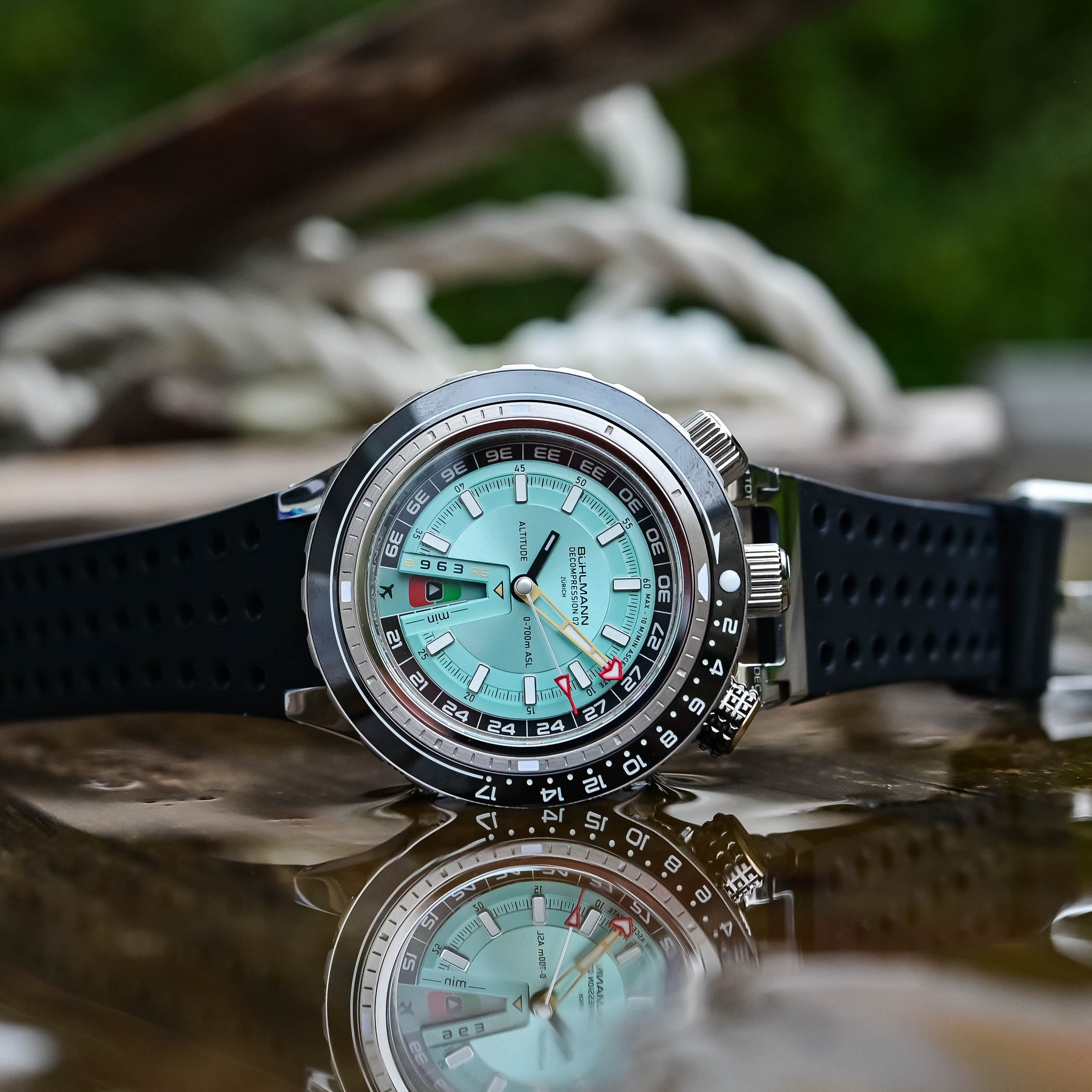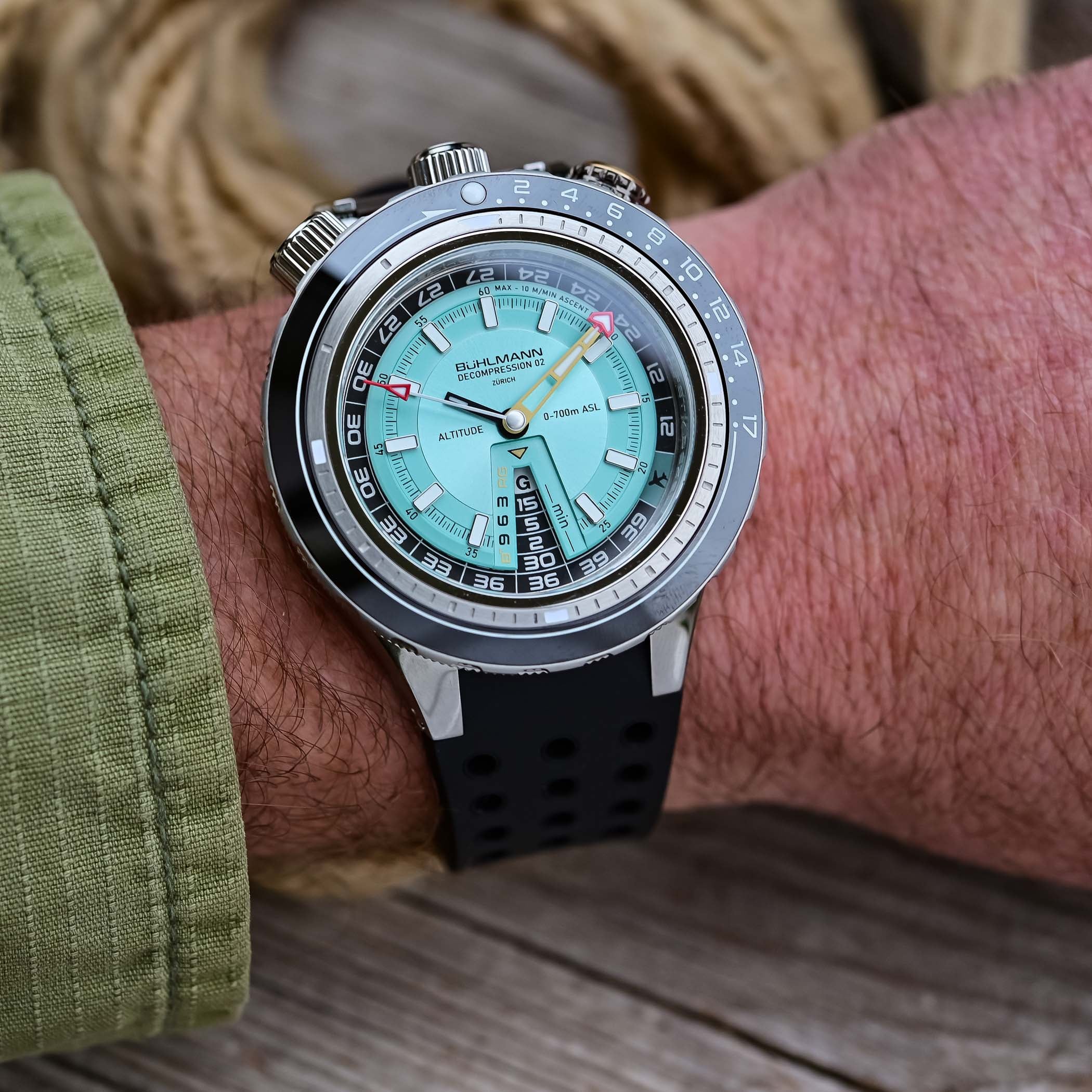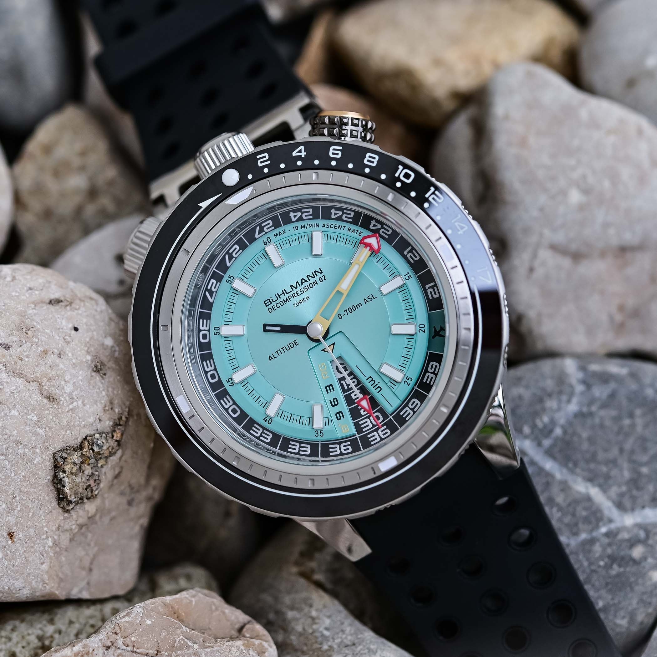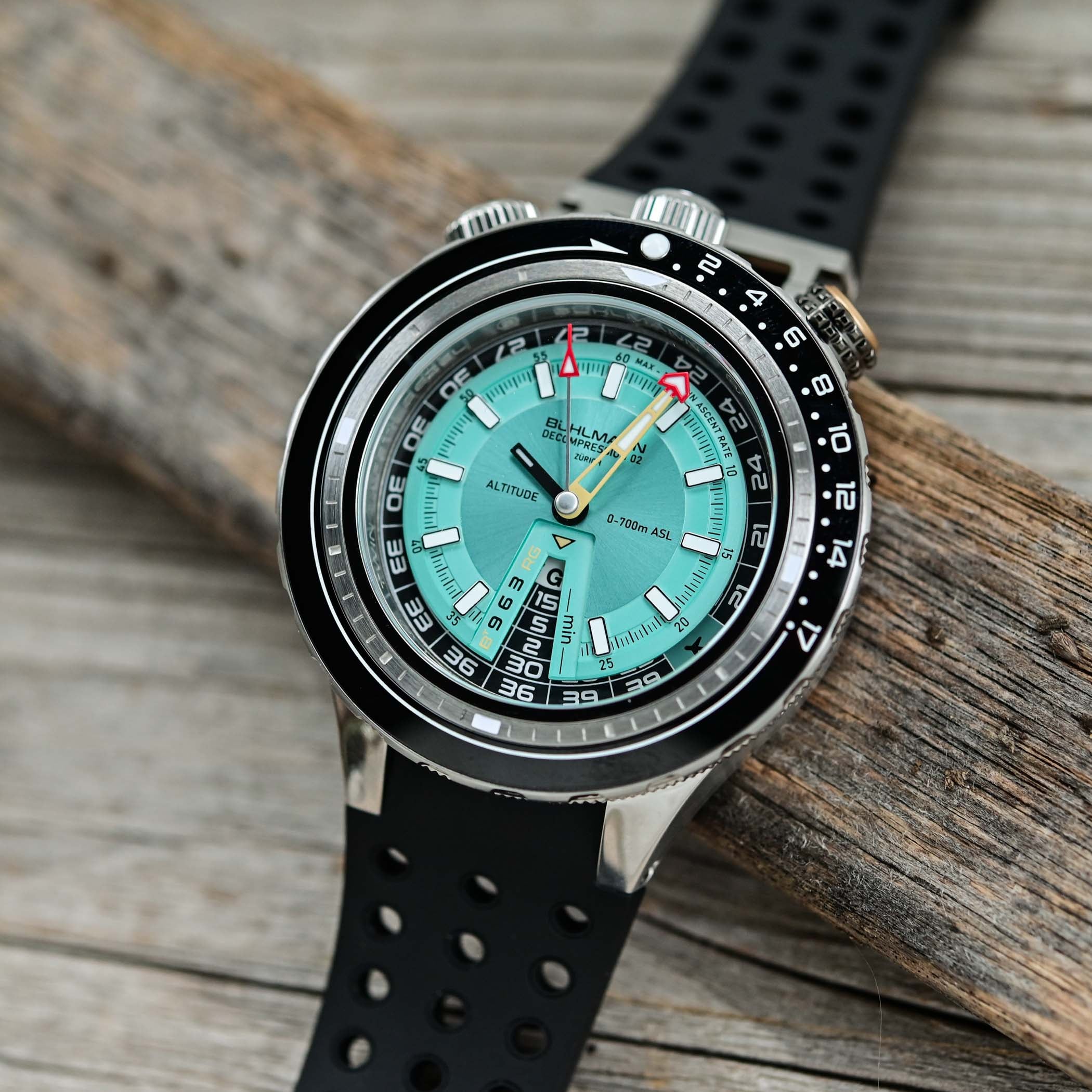 The Bühlmann Decompression 02 boasts a solid 575m water-resistance, a nod to Bühlmann’s record achieved in the Zürich hyperbaric chamber. With this rating, it’s fully prepared to follow you well beyond the 10-to-30-meter golden zone, the most enjoyable and safest depth range for recreational divers.
