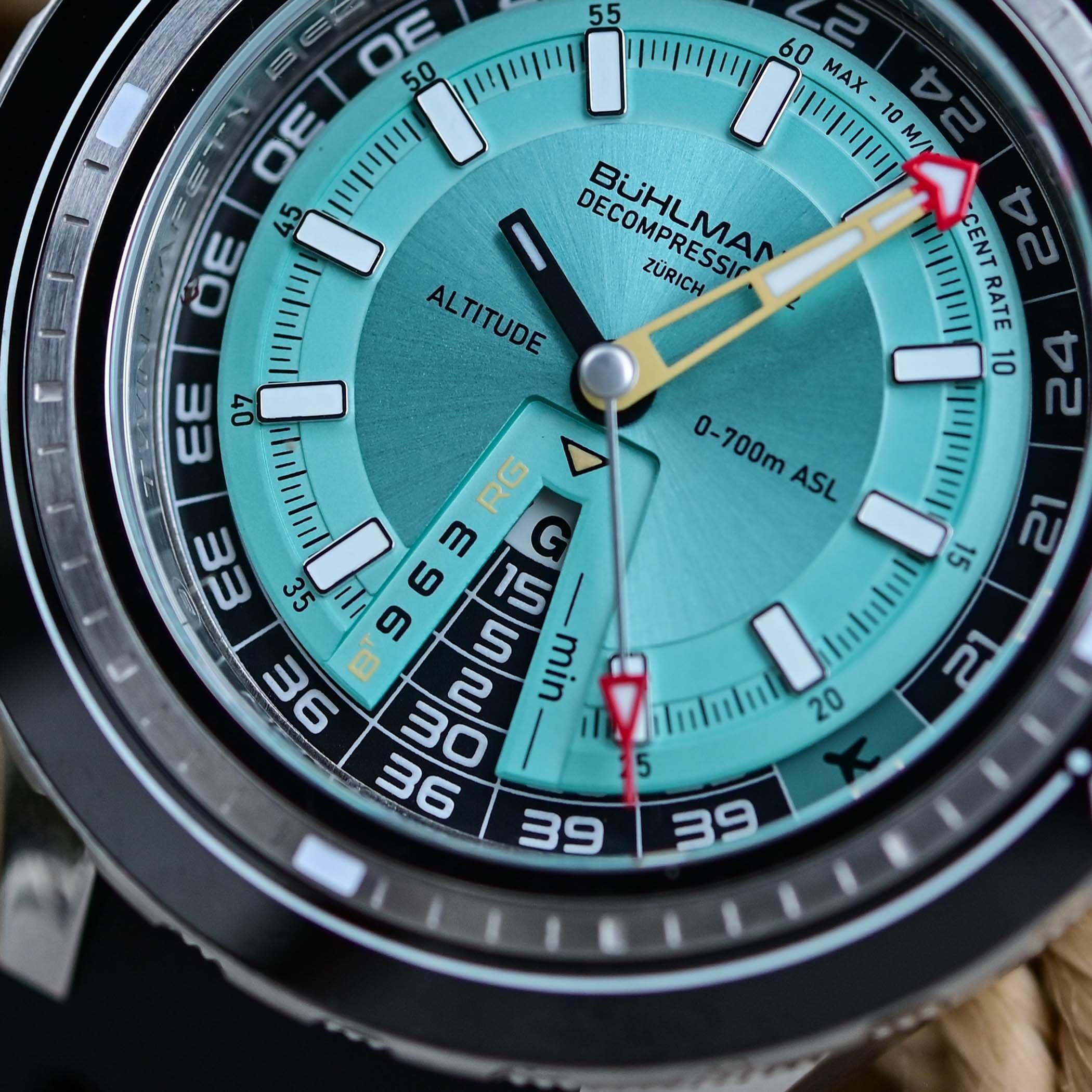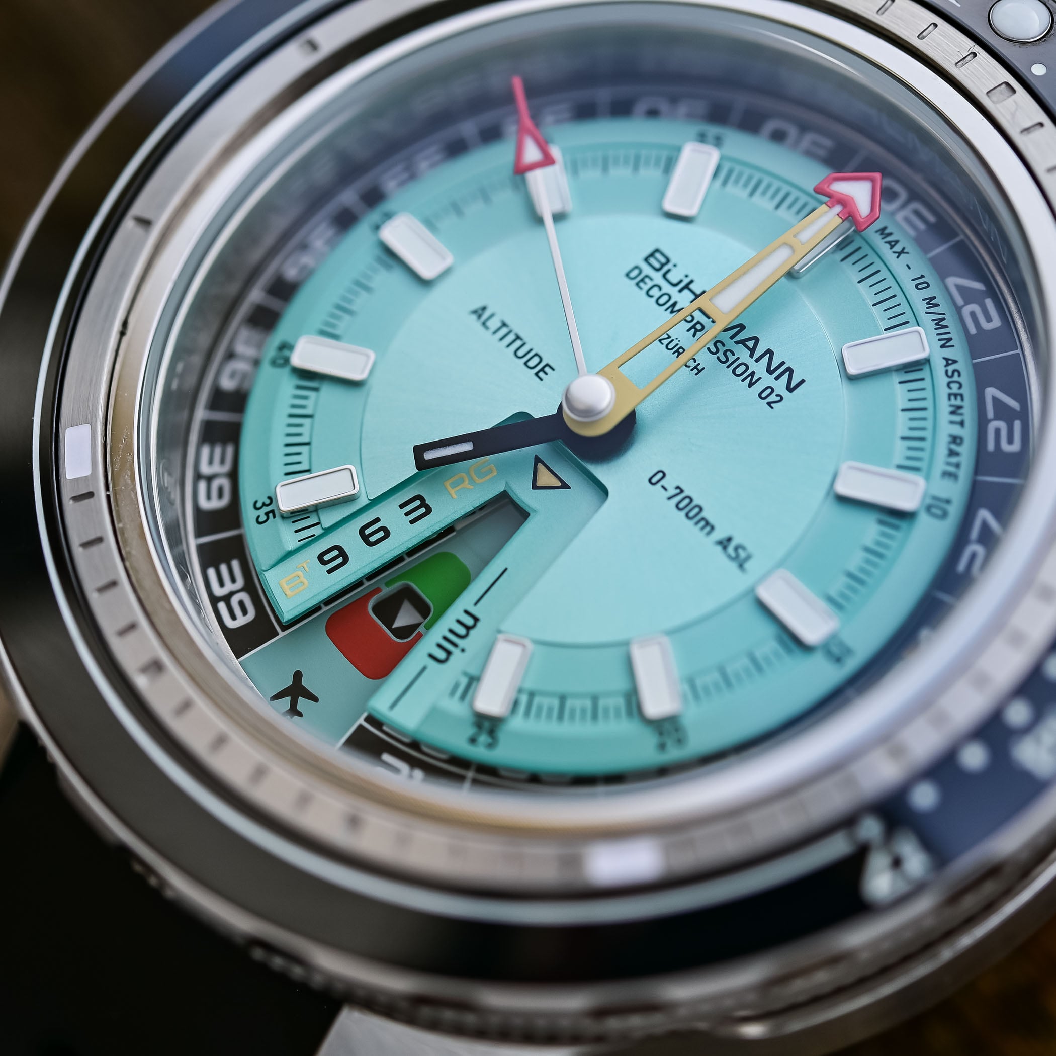 A rare function, at the end of the dive, the bottom dial is set to the “Fly-no-Fly” position and the corresponding indication is set to “no-fly” using the “date” setting position of the centre crown. An arrow points towards the red zone… It will be safe to fly once an arrow points to the green zone, once a minimum of 24-hour no-fly window is over (the “min” indicator means “check” as the date wheel might jump after 12 hours only).