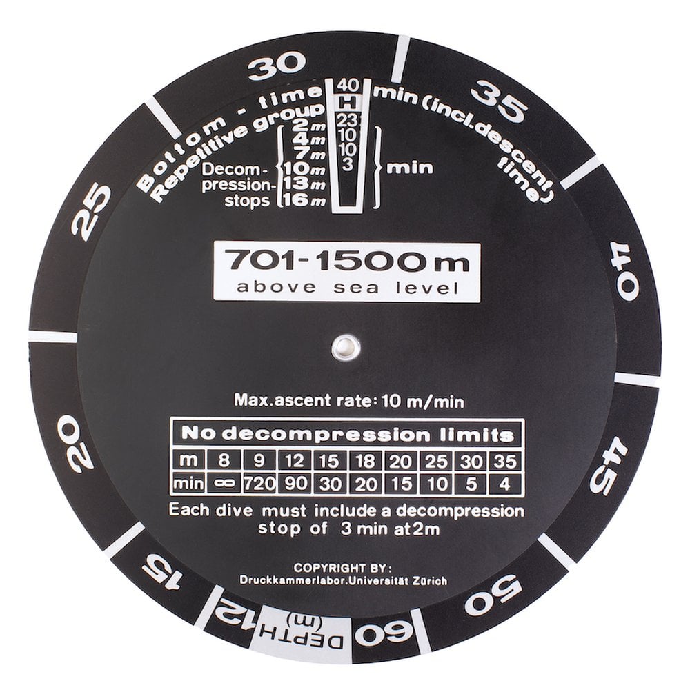 The Decompression 02 focuses on the “Golden Zone” dive profiles with the 17 most common dive profiles for single-tank dives up to 39 meters depth, for dives at altitudes from 0 to 700m above sea level, as inscribed on the dial.