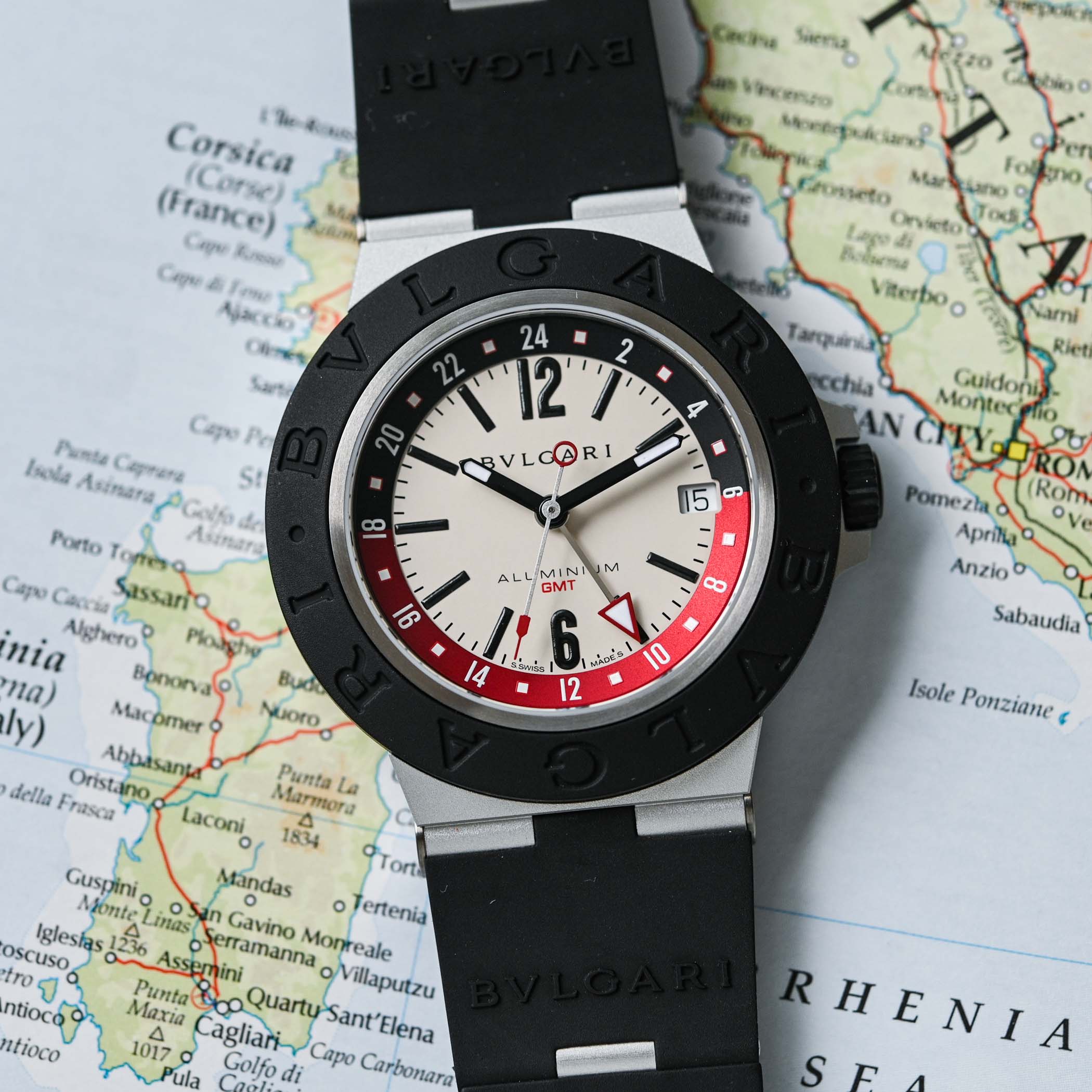 In addition to its unorthodox materials, the Aluminio featured the brand name Bulgari embossed into the rubber bezel not once but twice, making the brand name an integral part of the design. Originally appearing on the 1977 Bvlgari Bvlgari watch, the brand’s first industrially produced gent’s watch, the double mention of the brand name on the gold bezel was a nod to the tradition of Roman Emperors’ names stamped on coins. As a product that captured a very Italian design bravado, an image of the Bulgari Aluminio was strapped around the upper deck of an Alitalia Boeing 747 as part of a marketing campaign.
