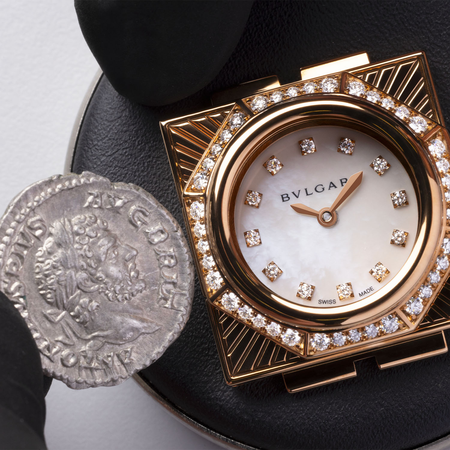 Proudly Roman and fascinated by ancient history, Bulgari began producing coin-set Monete jewellery and watches in 1966. Using ancient Roman and Greek coins set in necklaces, chokers, earrings, and rings, Bulgari’s Monete pieces, featuring emperors’ profiles, names, and dates, were a huge success. The emblematic Monete remains one of Bulgari’s most enduring lines, and today, Monete watches use antique coins to hide the dial/movement of its high-end models, such as the Bulgari Octo Finissimo Tourbillon or the Octo Roma Monete Skeleton Tourbillon.