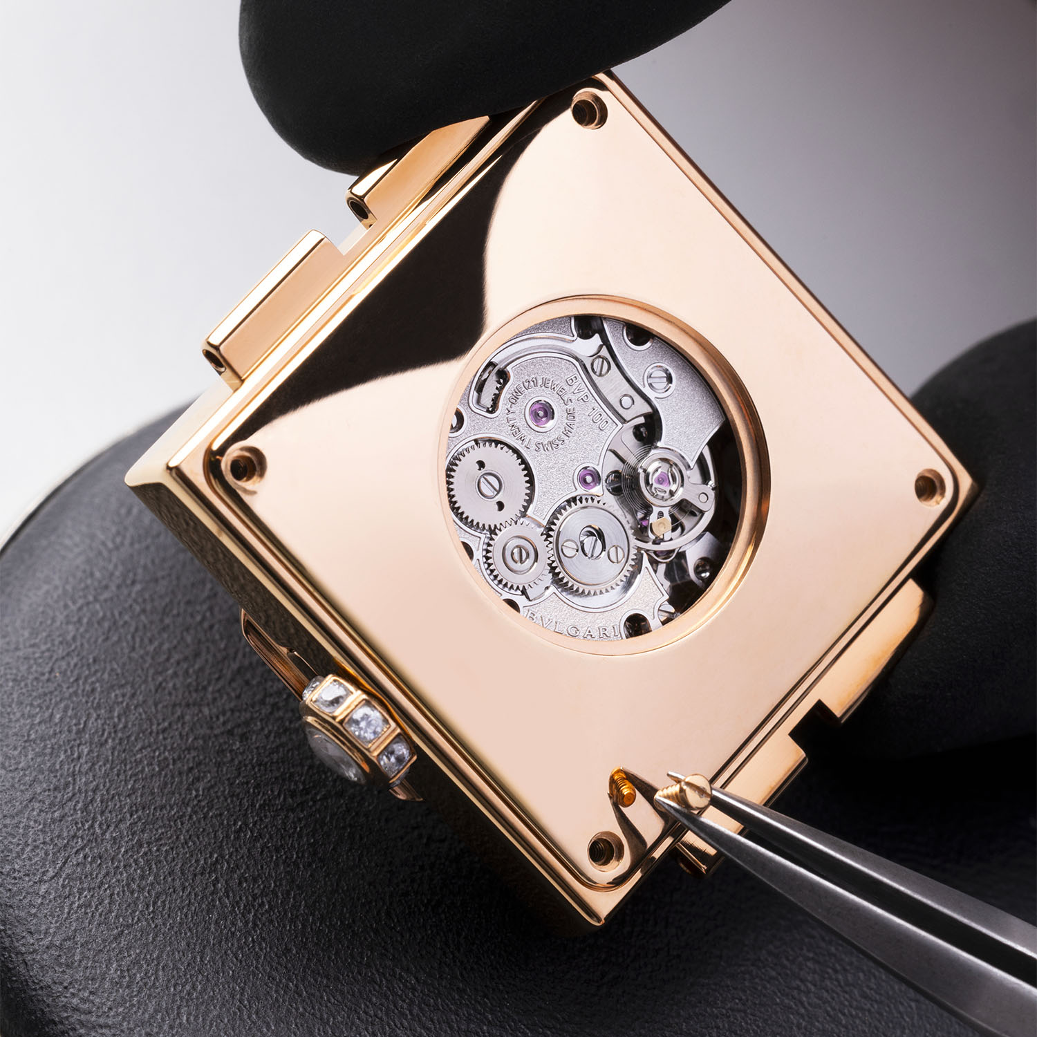 A small porthole on the caseback reveals the miniature marvel known as the Piccolissimo, the smallest round mechanical movement ever created. Produced in Bulgari’s manufacture in Le Sentier, Switzerland, the 102-component BVP 100 calibre has a diameter of 13.5mm, a thickness of just 2.5mm, weighs 1.9 grams, beats at 21,600vph and can store up to 30 hours of power reserve. In a departure from earlier models, this calibre can be wound by the crown.