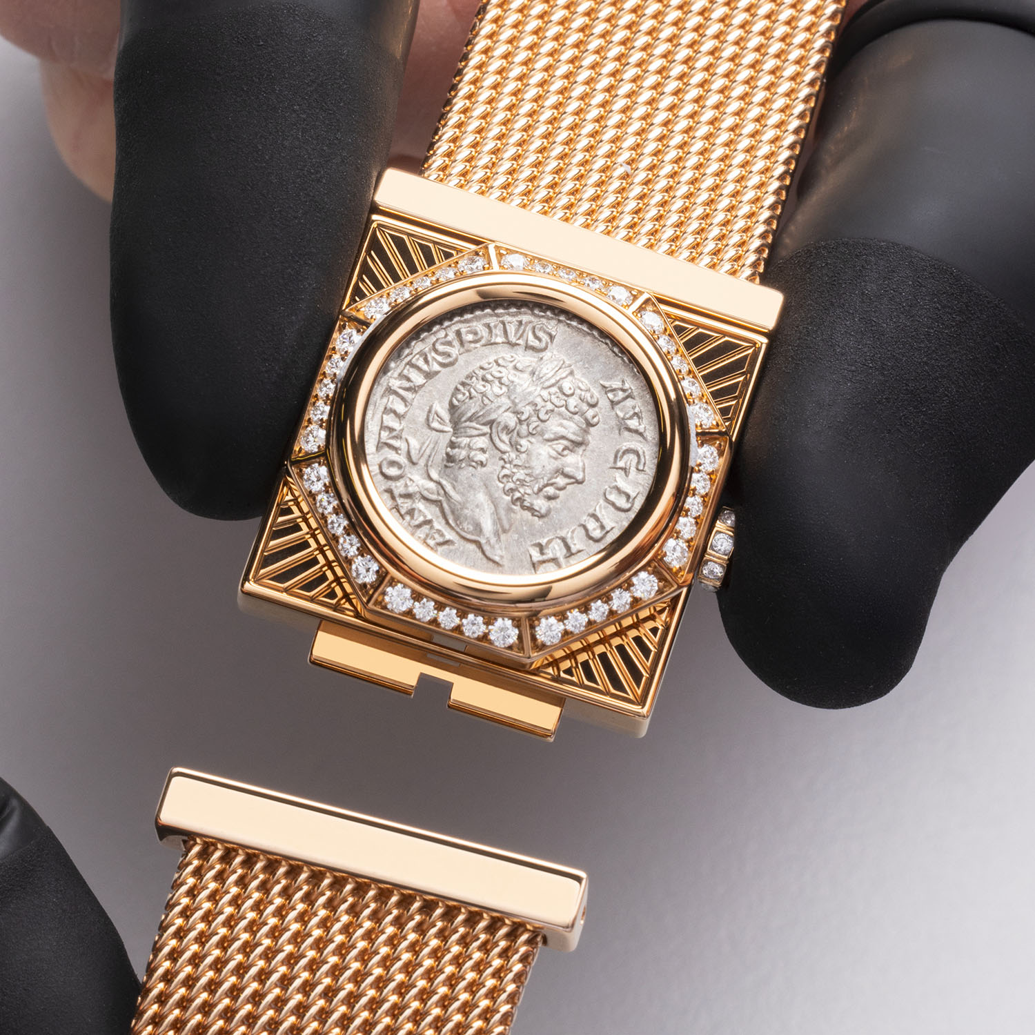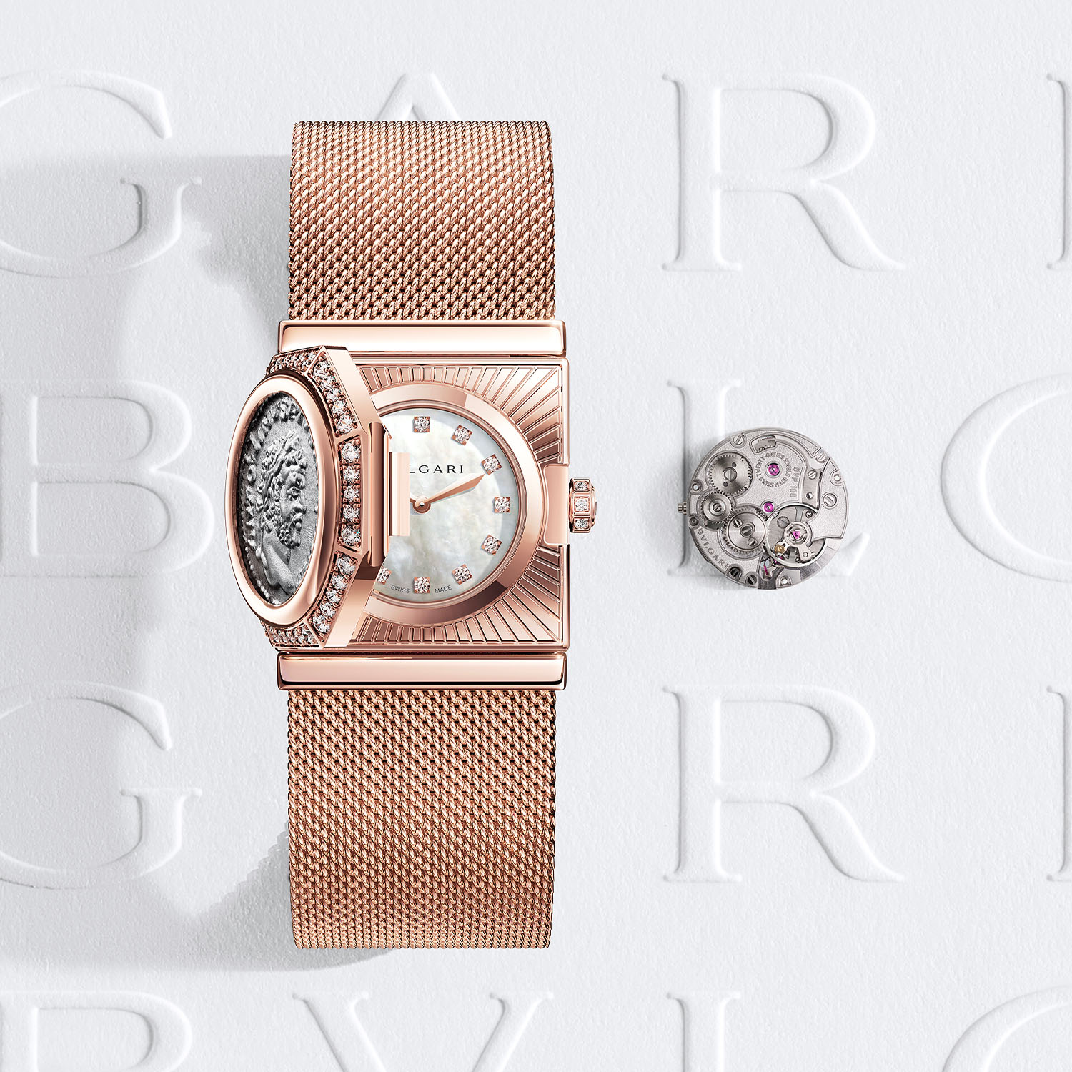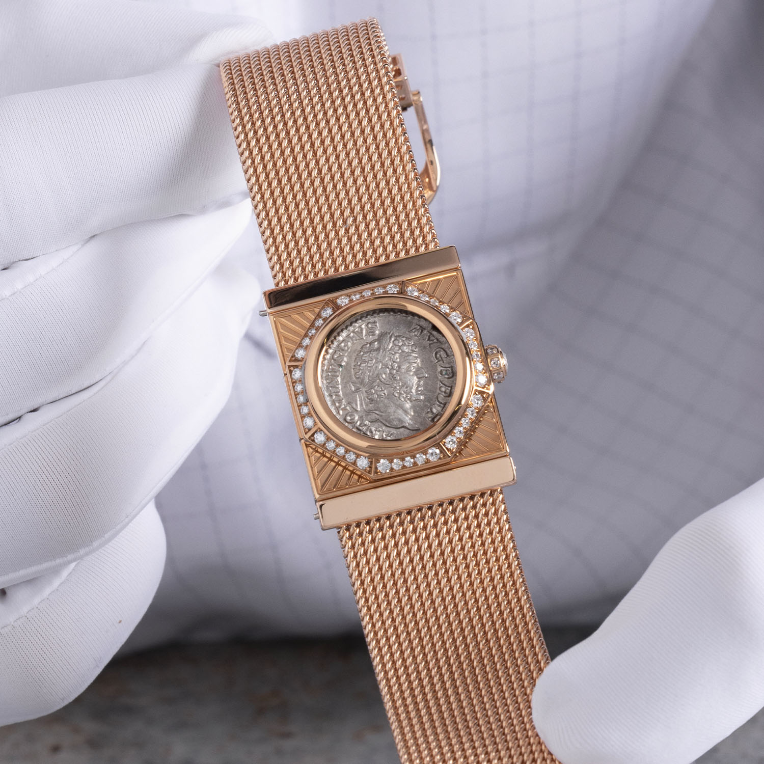 Somewhat similar to the Monete Catene secret watch of 2023, the Maglia Milanese Monete inaugurates the brand’s first Milanese mesh bracelet. Set in a rectangular rose gold case with a slightly Art Deco air, the centre is crowned by an authentic ancient Roman silver coin featuring the profile of Emperor Caracalla (dating from 198-297 AD). Playing with different shapes, the round coin sits inside a raised octagonal diamond-set frame. Fitted with a hinge, the coin can be lifted to reveal a white mother-of-pearl dial with diamond indices and a series of sunbeams radiating from the bezel to the case’s edges. Matching the diamond-set octagonal bezel, the rose gold crown is also octagonal, set with diamonds and a diamond cabochon on its tip.
