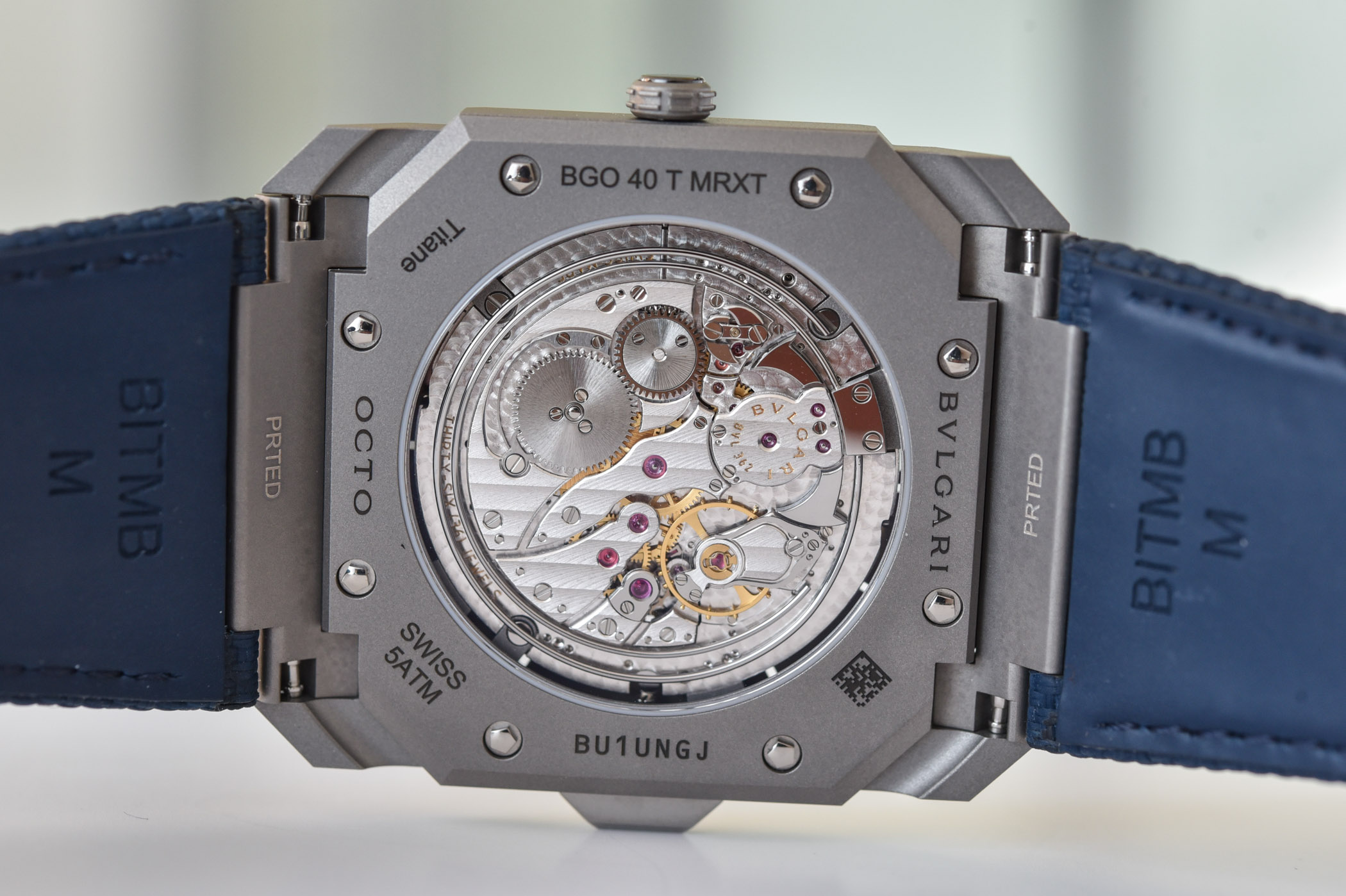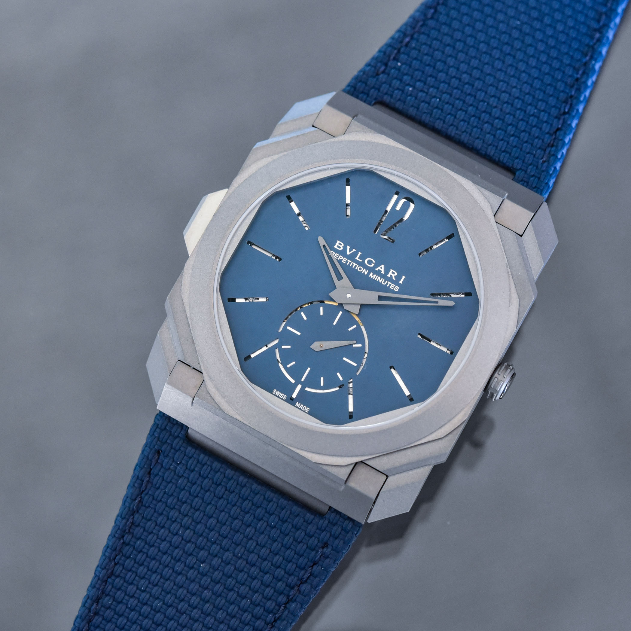 Quick facts: ref 103669 – 40mm x 6.61mm titanium case with transparent caseback – hand-wound calibre BVL 362 (3.12mm thick) – 21,600vph – 42-hour power reserve – hours, minutes, small seconds, minute repeater – blue rubber strap and titanium buckle – EUR 195,000