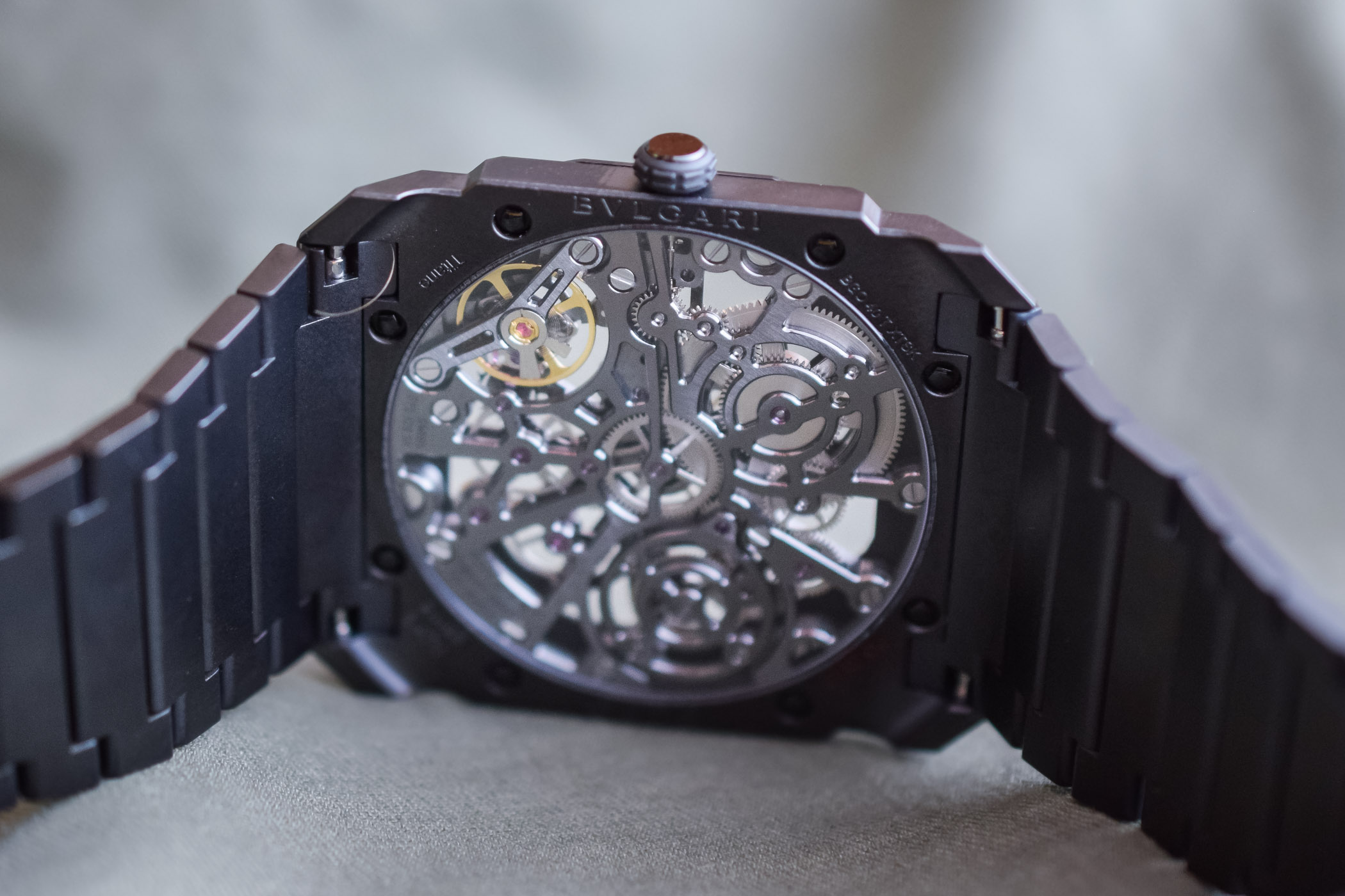 The first impression with the 40mm black DLC-coated titanium case is one of style. Like the movement it encloses, its thickness has been reduced to a bare minimum of 5.37mm. The integration of the bracelet with the case is perfect. Ultra-thin, light-weight, flexible, it’s an elegant watch that offers a snug, comfortable fit. A demonstration of attention to the smallest details, the folding clasp is literally set inside the bracelet which respects the overall thinness of the watch even on the other side of the wrist. It feels stunning on the wrist and we can thoroughly recommend that you go hands-on with this Octo Finissimo skeleton black edition, if only just to check it out in person.