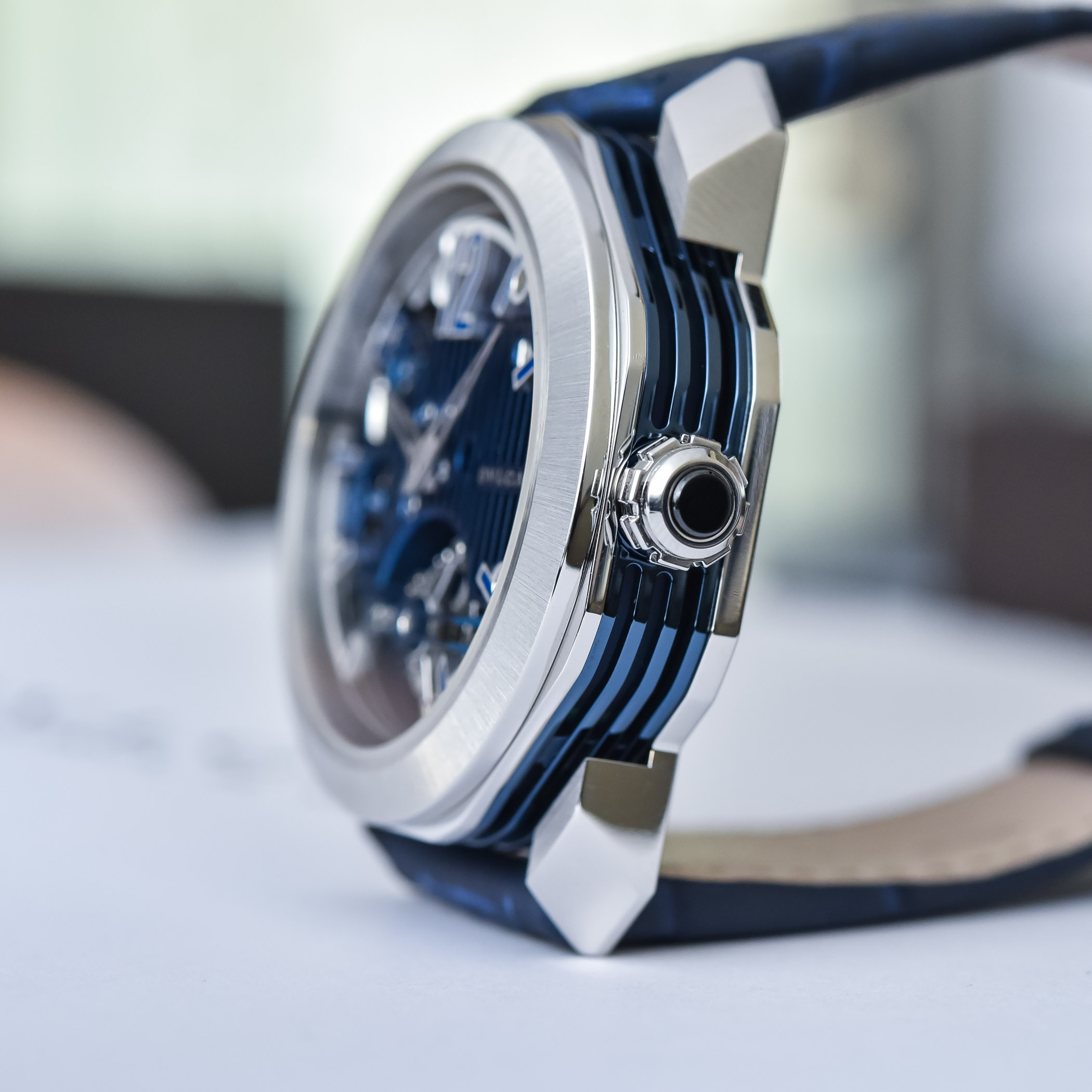 The movement of the Bvlgari Octo Roma Blue Carillon Tourbillon is housed in the architectural octagonal Roma case. Measuring 44mm in diameter, it is made of platinum with a blue titanium middle case. The crown and the pusher are in white gold. The caseband is designed to maximise sound and allow its diffusion. The various grooves are meant to reduce the amount of metal between the inside and outside, and the three openings on the caseband correspond to the three gongs, thus allowing the sound to exit the chamber in an optimal way (the gongs are attached directly to the body of the case for optimal sound transmission). The back is also hollowed out for the same reason.