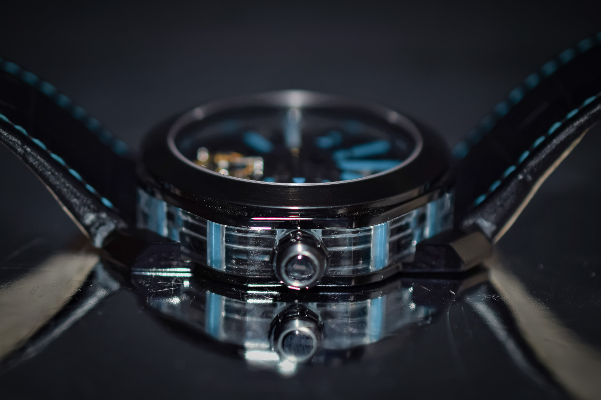 The middle part is made of sapphire allowing the light to pour in and magnify the openwork mechanical heart of the watch, which is dramatically enhanced with inserts crafted from blue Super-LumiNova® and ITR2® ( Innovative, Technical and Revolutionary Resin – a unique composite material laden with carbon nanotube particles and endowed with metal-like hardness). Ten DLC-coated bridges, incorporating capsules made of the same materials, radiate from the center to create highly legible hour markers. The contrasting colors and materials are striking, bringing out the architectural and kinetic character of the movement.