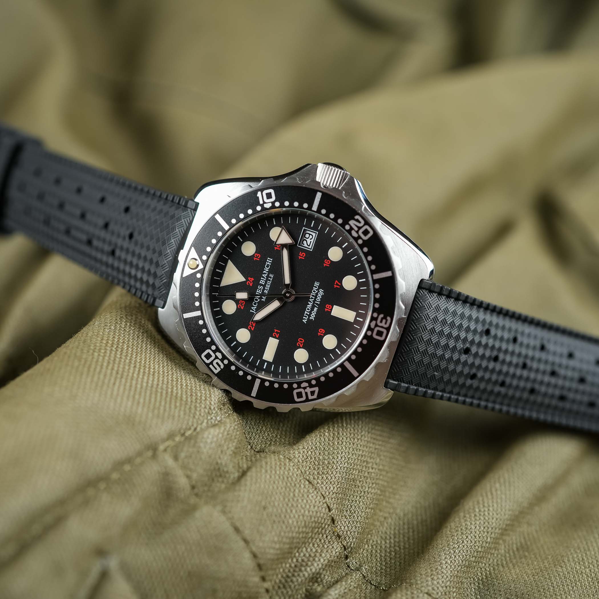 Again, a very important question. What should you use to secure your watch on your wrist? Let me just start with what not to use: a leather strap. The wrong strap can ruin your summer experience, and leather is bound to let you down. Leather absorbs sweat and water and is damaged by the combination of humidity and heat. During hotter days, we’ve all experienced discomfort from a sticky leather strap. So, rule number one: leave your nice leather strap along with your gold dress watch and vintage chronograph in the safe. It will also benefit from a few days off. Waterproof leather straps exist, but they are not the norm.