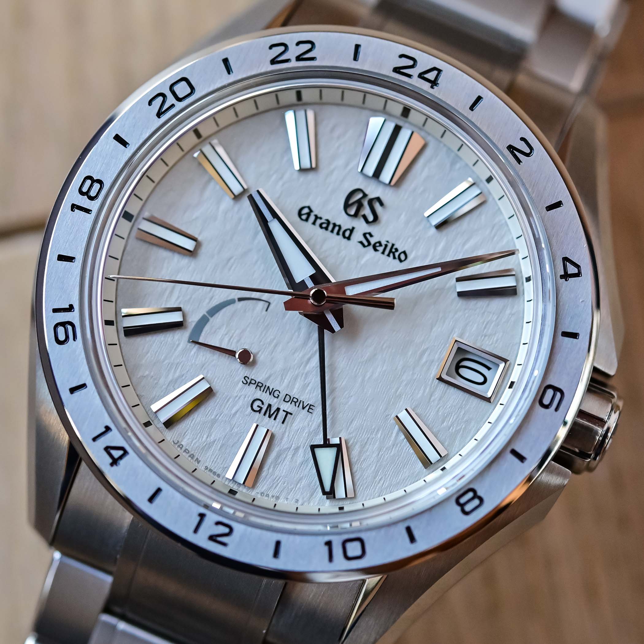 Quick Facts – 41mm x 13.9mm – high-intensity titanium case – fixed bezel with 24h scale – sapphire crystal front and back – 100m water-resistant – light grey dial with snowflake texture – faceted applied markers and hands with luminous inserts – framed date window – power reserve display – Calibre 9R66, in-house – Spring Drive – 30 jewels – 72h power reserve – accuracy ±1 second per day or ±15 seconds per month – titanium bracelet with folding clasp – EUR 8,500