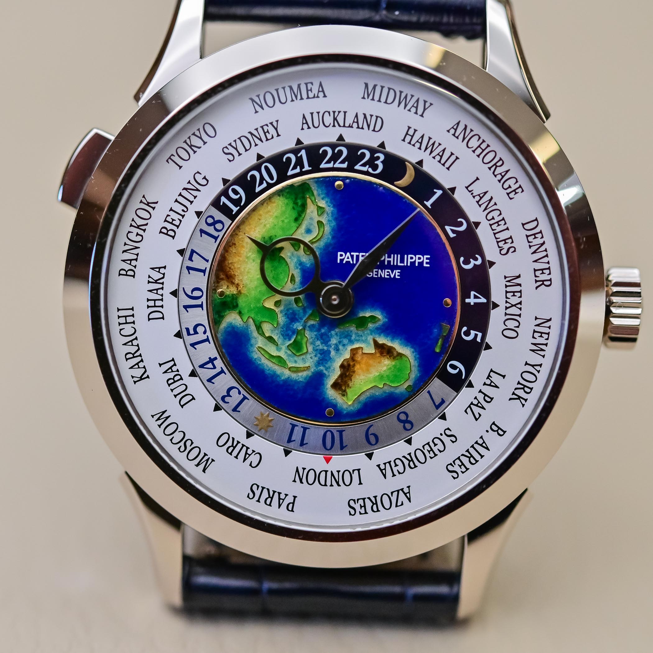 Quick Facts – 38.5mm x 10.23mm white gold case – self-winding caliber 240 HU, World Time, 24-hour and day/night indication for all 24 time zones – grand Feu cloisonné enamel center: Oceania and South-East Asia, 4 gold spangles – sapphire-crystal case back- water resistant to 30m – hand-stitched alligator strap – fold over clasp – CHF 75,000