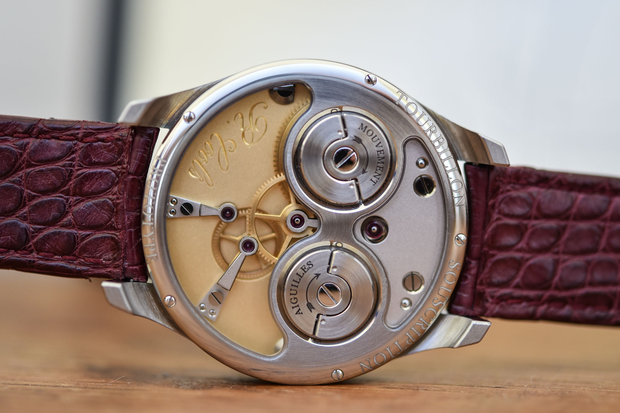 Quick facts: 40mm x 15mm – steel case – hand-wound in-house movement – hours, minutes and one-minute tourbillon – black alligator strap with steel pin buckle – limited edition of 9 pieces available on subscription – CHF 85,000