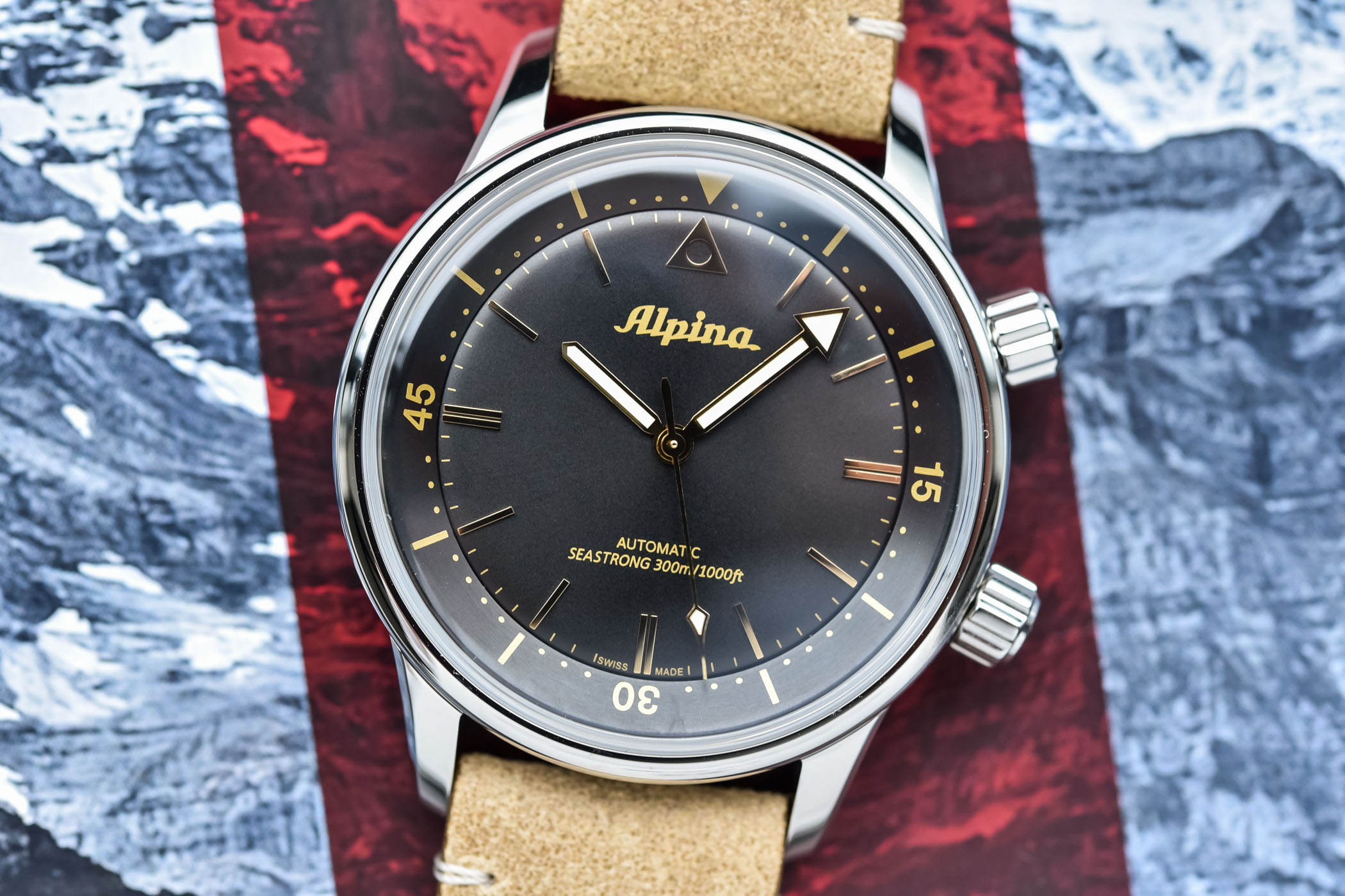Quick facts: 42mm stainless steel case – internal rotating bezel – screw-down crown – 300m water-resistant – black gilt dial – AL-520 calibre (Sellita automatic SW200) – brown calf leather and additional black rubber strap – EUR 1,495