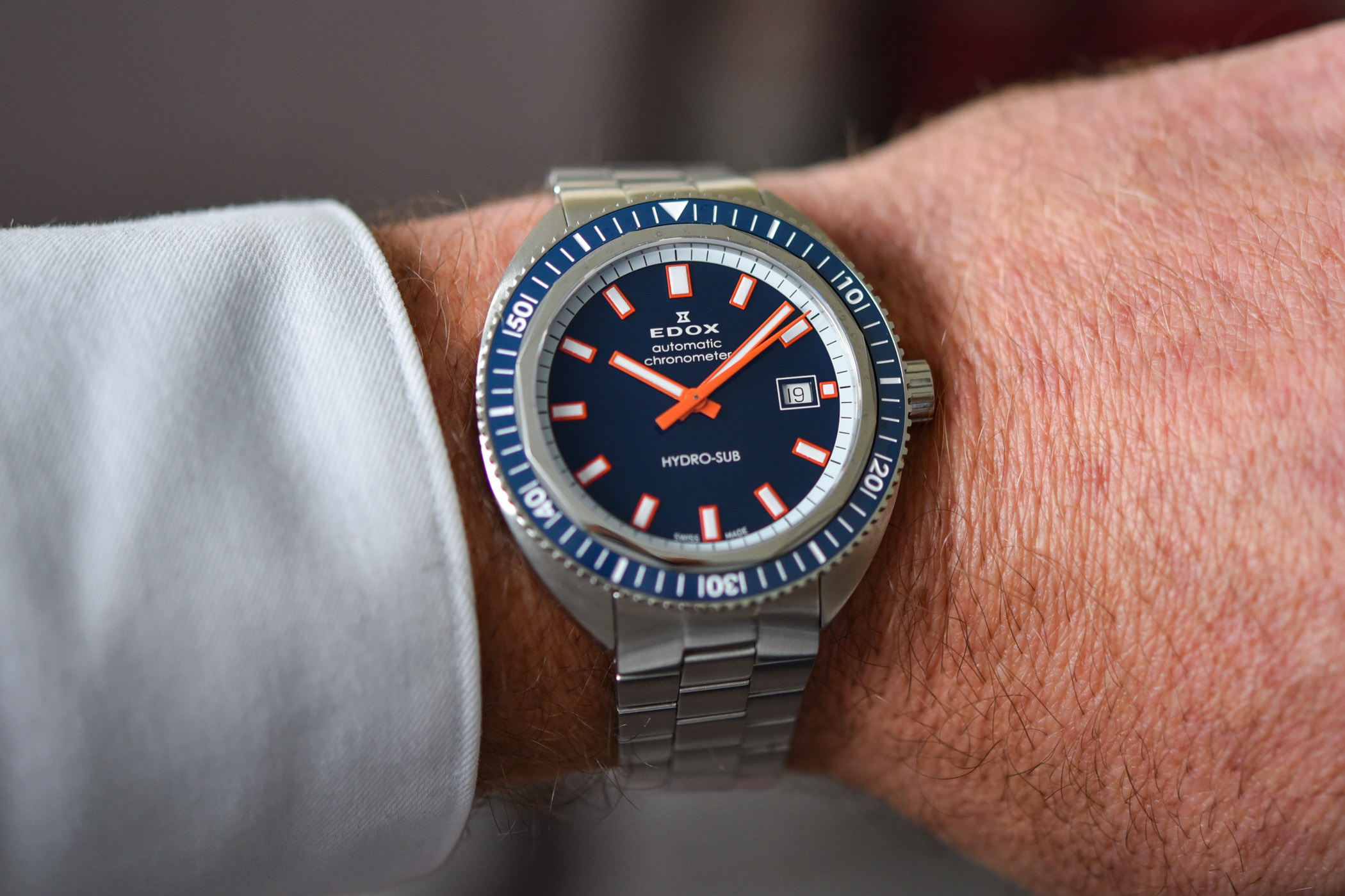 Edox has a long history in the field of dive watches, with several important models in its archives. In recent years we’ve seen a bit of a resurgence of the brand’s collections of divers through various Skydiver models in either a vintage or more contemporary design. A few months ago, that’s another historical watch that has been brought back to life, one of the best-known dive watch collections by Edox, the Hydro-Sub. The original 1960s model was impressive back then, with high water-resistance. And the new one not only keeps this alive but also revives a cool, original design with coloured accents, for the fun. The 42mm barrel-shaped steel case is topped by a ceramic bezel. The funky dial is available in black but also in this blue version with orange hands and markers… And it really looks cool. Inside is Sellita SW200 automatic that is Chronometer-certified by COSC, and it’s worn on a three-link stainless steel bracelet with a folding clasp. All of that for EUR 1,790. Not bad!