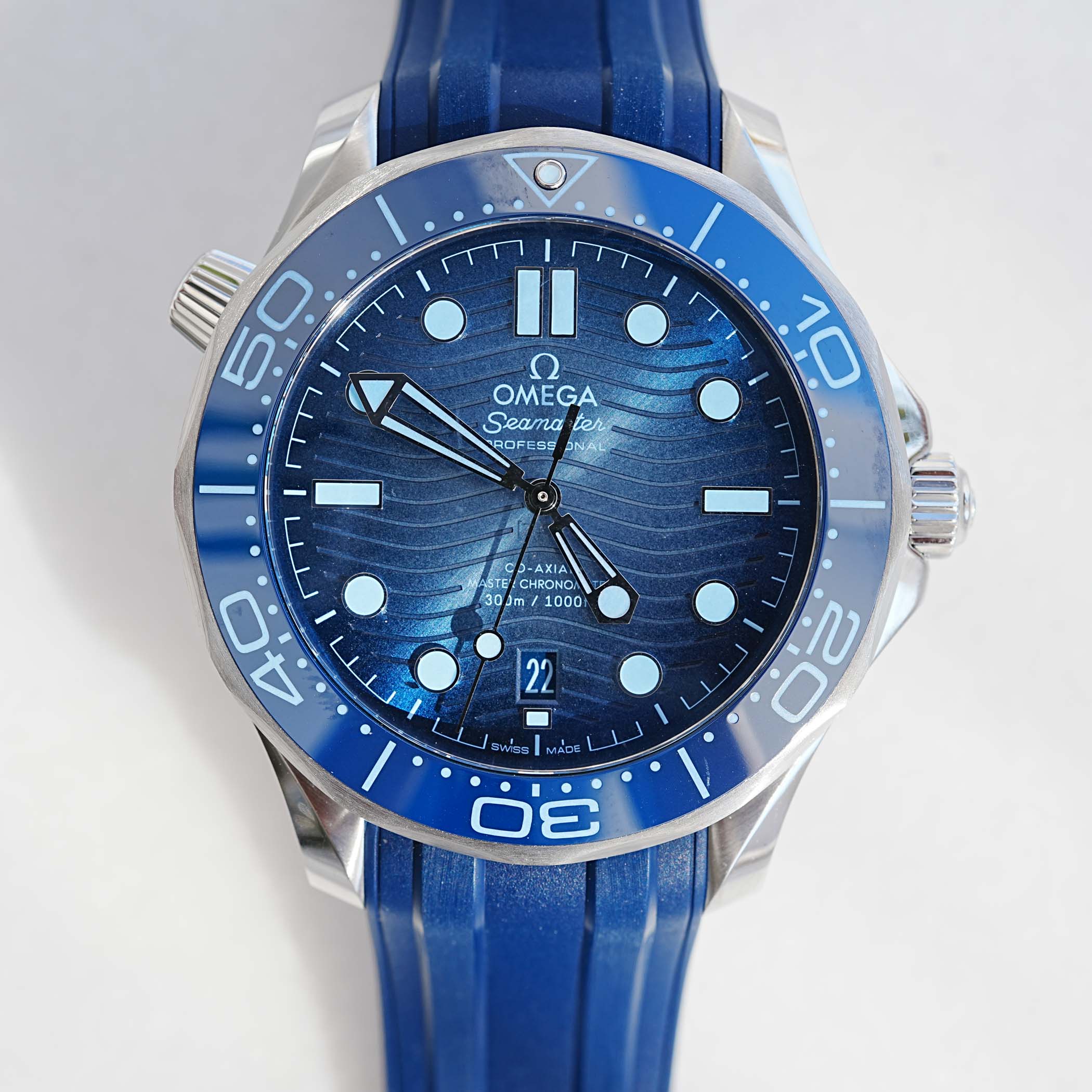 Quick Facts – 42mm x 13.5mm – stainless steel case, brushed & polished – unidirectional rotating bezel – blue ceramic insert – helium escape valve – sapphire crystal – solid caseback – 300m water-resistance – sunray brushed gradient blue ceramic wave dial – indices & hands with light blue Super-LumiNova – calibre 8800, in-house automatic – co-axial escapement – Master Chronometer certification – 25,200vph – 55h power reserve – blue rubber strap or steel five-link bracelet with folding clasp – EUR 6,400 (rubber strap) or EUR 6,700 (steel bracelet)
