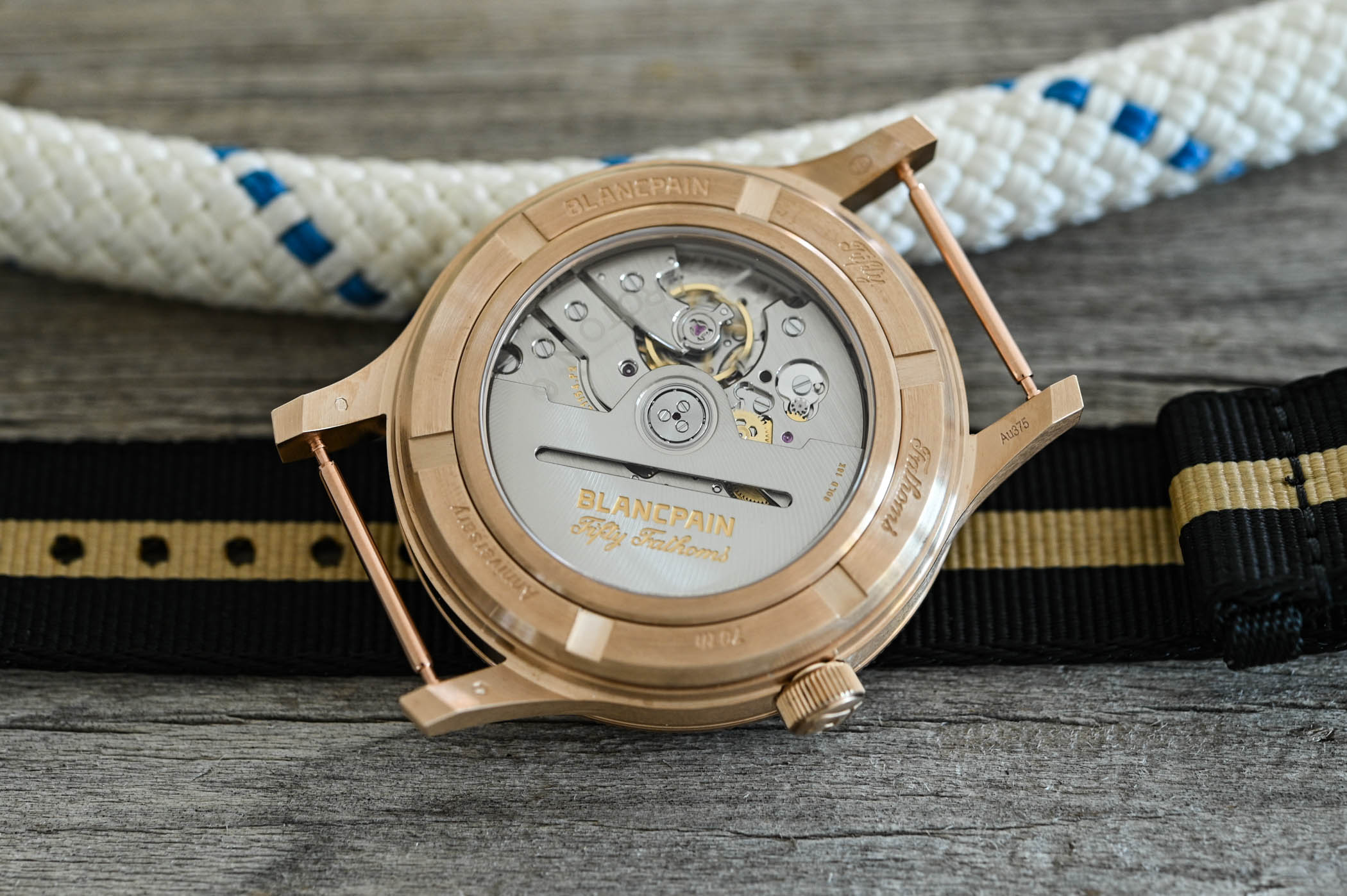 Quick Facts – 41.30mm x 13.30mm – 9ct bronze-gold case – unidirectional bronze-gold rotating bezel with black ceramic insert – sapphire crystal front & back – 300m water-resistant – black dial with moisture indicator – vintage Super-LumiNova on indices & hands – calibre 1154 P2, in-house automatic – 21,600vph – 100h power reserve on twin barrels – silicon balance spring – 1000 gauss anti-magnetic – two-tone NATO-style strap with pin-buckle – limited edition of 555 pieces – CHF 30,000