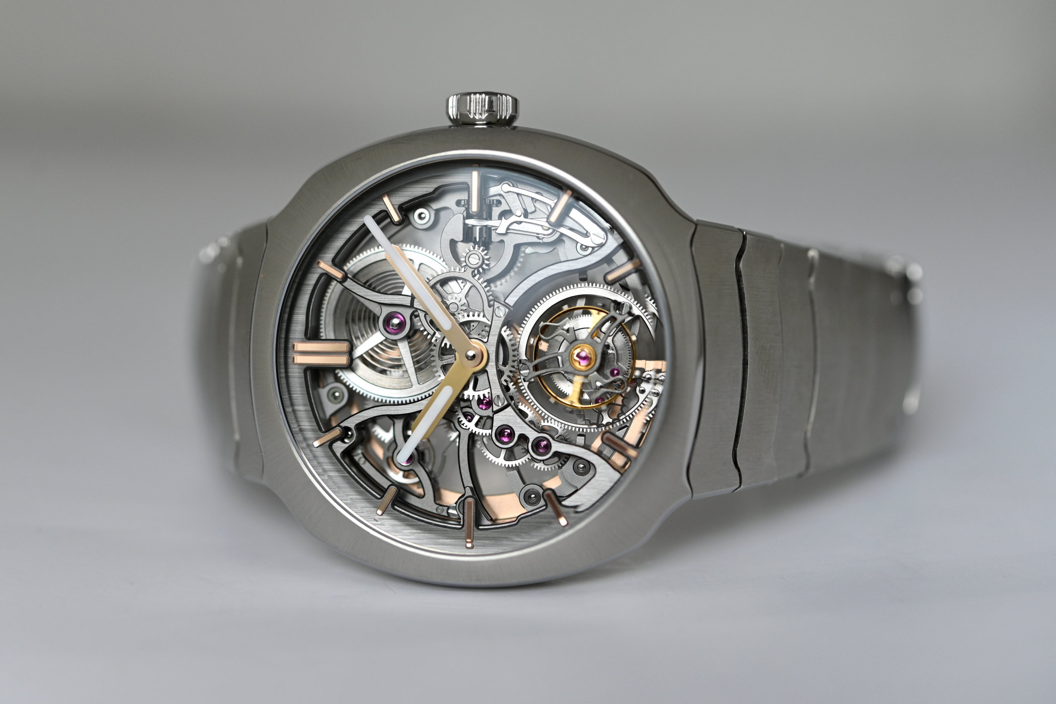 Quick facts: 40mm x 12.1mm stainless steel case – openworked dial with red gold-plated indices and hands – calibre HMC 814, in-house, automatic tourbillon with double-hairspring, 72h power reserve – integrated bracelet in stainless steel with folding clasp – CHF 79,000