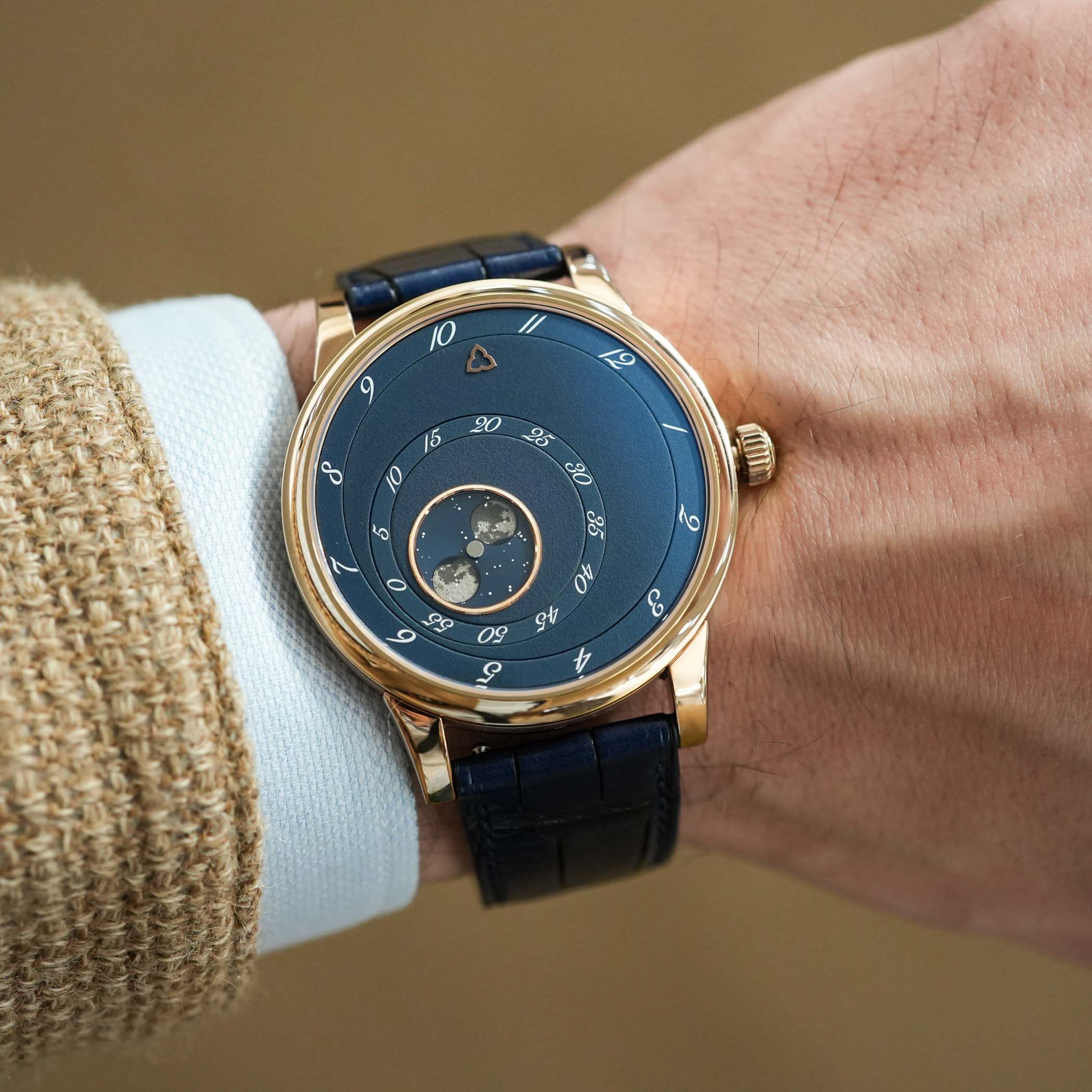 Quick facts: 38.5mm or 40.5mm x 9.2mm grade 5 titanium or 18k rose gold case – grained blue or dune-toned dial with three concentric discs to display the time and moon phases indicator with running second sapphire disc – calibre X-centric, proprietary made by Le Cercle des Horlogers, automatic with micro-rotor, 48h power reserve – alligator leather strap – from EUR 14,500 in titanium and EUR 26,500 in gold