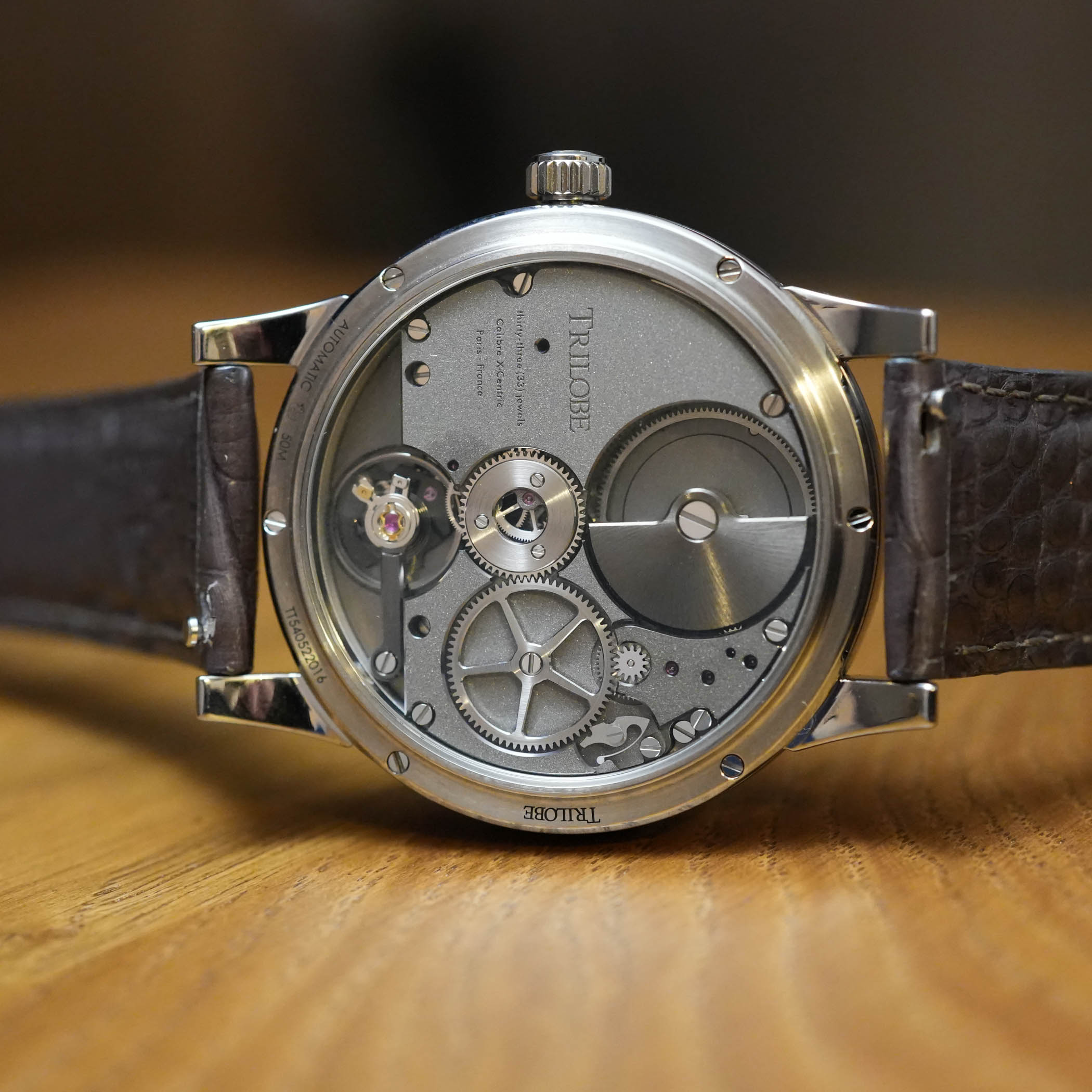Last but not least, a new edition of the Trilobe Les Matinaux, and probably the most consistent version to date. Dubbed L’Heure Exquise, this new edition adds a moon phase indication, adding to the already poetic display the brand is known for. Elegant, charming and somehow romantic, this new Trilobe won our hearts. Available in titanium or gold, with options for 38.5mm or 40.5mm cases, it relies on a series of discs to indicate the time. What’s new is the inner disc with phases of the moon on the lower level and, on top of it, a sapphire disc with stars rotating at the rhythm of the seconds. The back reveals the brand’s X-centric calibre made by Le Cercle des Horlogers, with its minimalist approach. One of the most charming watches we’ve seen at the fair, whether with a dune-toned or a blue dial.