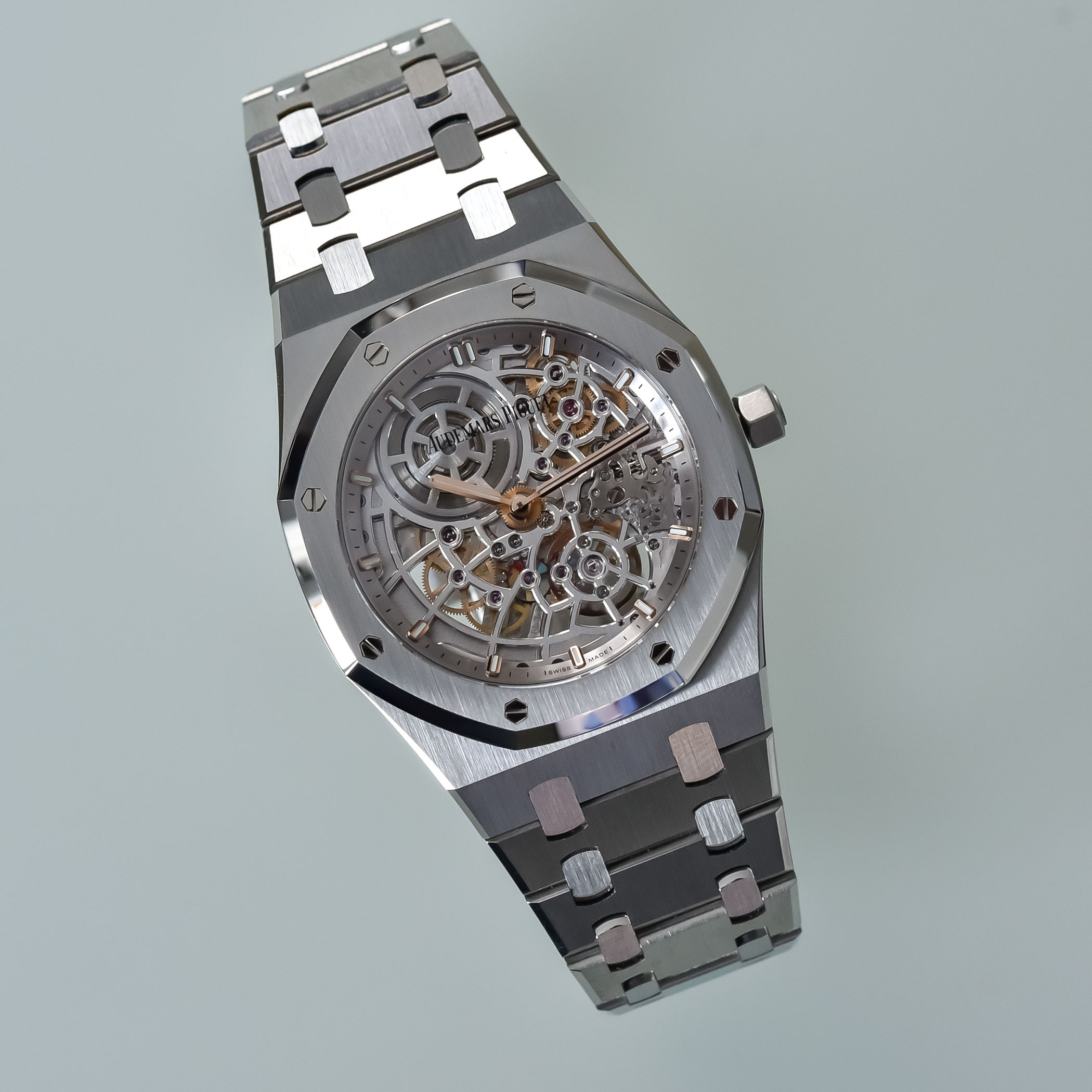 Quick Facts – 39mm x 8.1mm – stainless steel case, brushed & polished – octagonal bezel – sapphire crystal front & back – 50m water-resistant – rhodium-toned openworked movement – gold indices and hands – Calibre 7124, in-house – automatic winding – skeletonized construction – 211 parts – 28,800vph – 57h power reserve – hours & minutes – integrated steel bracelet with folding clasp – 16204ST.OO.1240ST.01 – EUR 86.800