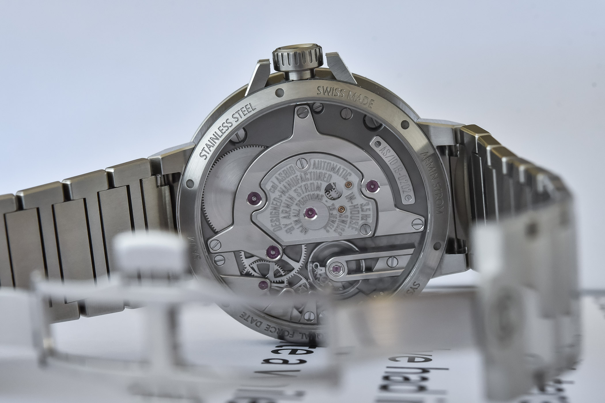 Quick Facts – 43.4mm x 12.6mm – stainless steel case, brushed & polished – fixed ceramic bezel – sapphire crystal front & back – 50m water-resistant – exposed mechanics with off-centred black dial – central date pointer with on/off system – Calibre ASS20, in-house – micro-rotor automatic – 25,200vph – 273 components – 72h power reserve – hours, minutes, small seconds, column-wheel date, power reserve indication on the barrel – stainless steel bracelet – EUR 31,300