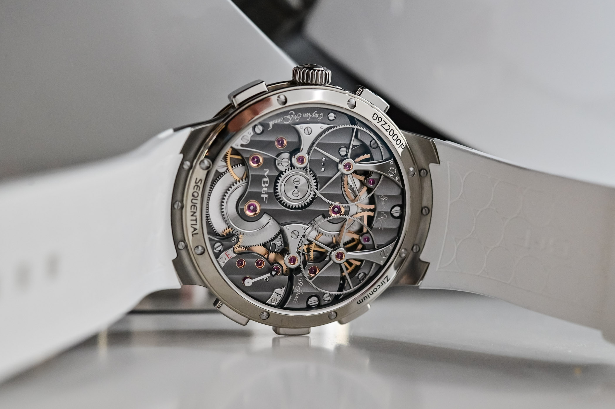 Quick facts: 44mm zirconium EVO case – openworked dial in orange CVD or black PVD – in-house movement conceived with Stephen McDonnell for MB&F, hand-wound, integrated dual chronograph with two column wheels and Twinverter switch allowing multiple timing modes, 3Hz, 72-hour power reserve – CHF 160,000 / EUR 160,000