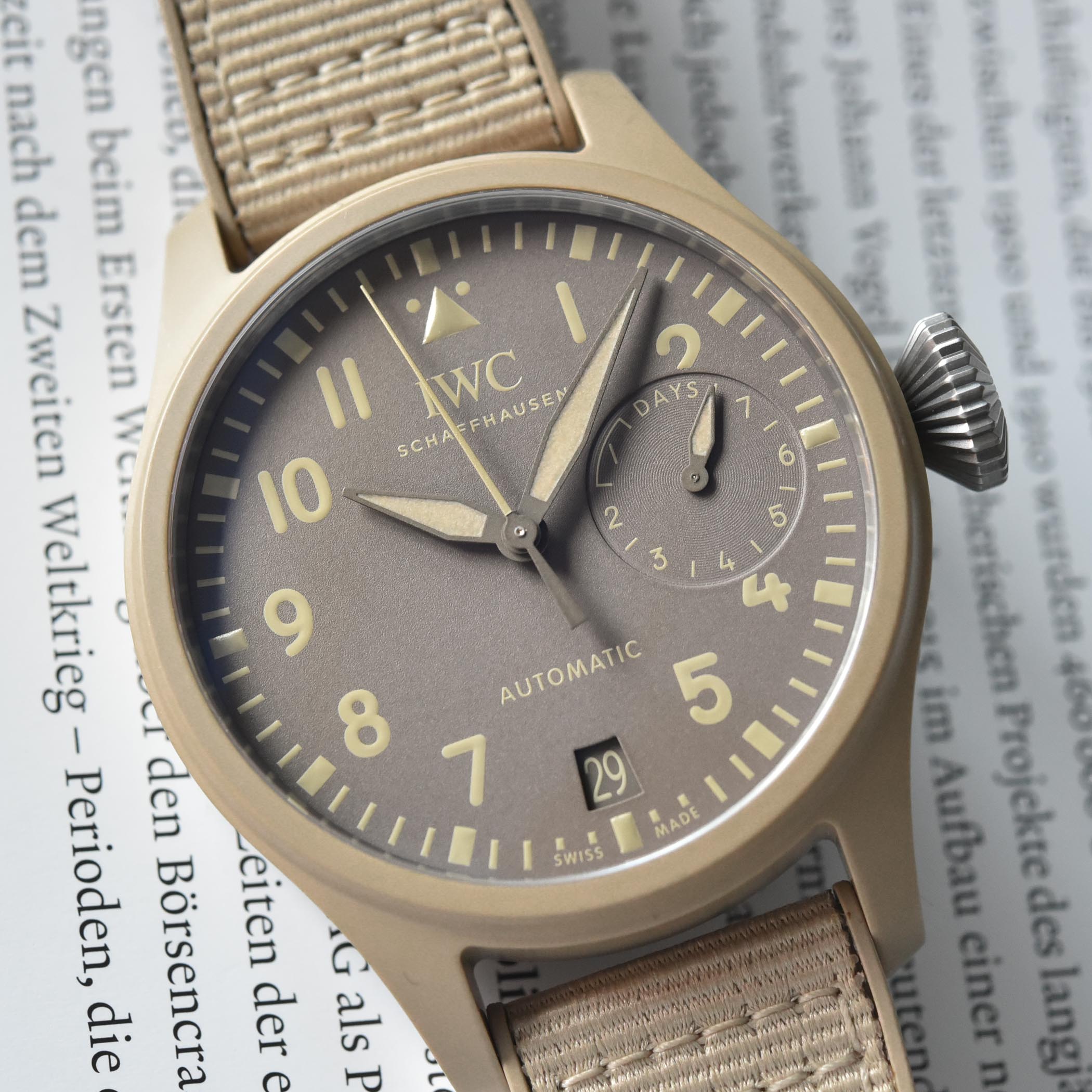 Quick Facts – 46mm x 14.6mm – matte sand-coloured ceramic case – sapphire crystal – titanium caseback & crown – 60m water-resistant – matte brown dial with sand-coloured numerals, markings & hands – IWC Calibre 52110, in-house automatic – 28,800vph – 7-day/168h power reserve – soft-iron inner case – hours, minutes, seconds, date, power reserve indication – sand-coloured rubber strap with textile inlay – limited to 250 pieces – EUR 14,900