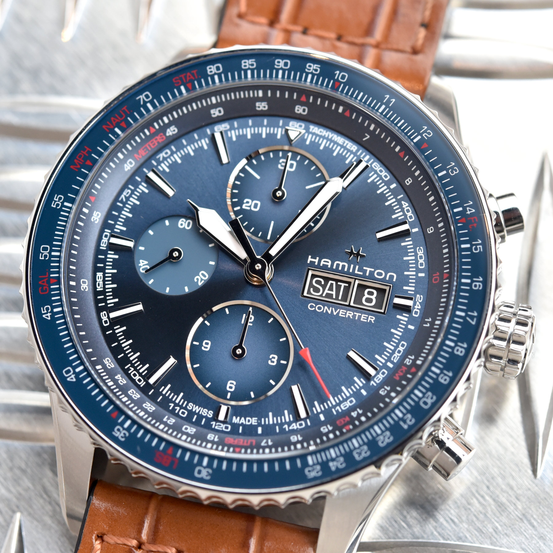 We’re coming down to earth price-wise, yet take to the skies with our last pick; the Hamilton Khaki Aviation Converter Auto Chrono in blue. This striking-looking Pilot’s Chronograph acts as a proper flight instrument on the wrist. With this many indications and scales to make in-flight calculations, it’s no wonder you need a bit of space. At 44mm wide, it’s a properly large watch, but it demands it and remains somewhat balanced in look. Any smaller and it would look just too cluttered and legibility would be an issue. It relies on the Calibre H-21-Si, a variation of the ETA/Valjoux 7750 and retails for EUR 2,245 on leather or EUR 2,295 on a bracelet.