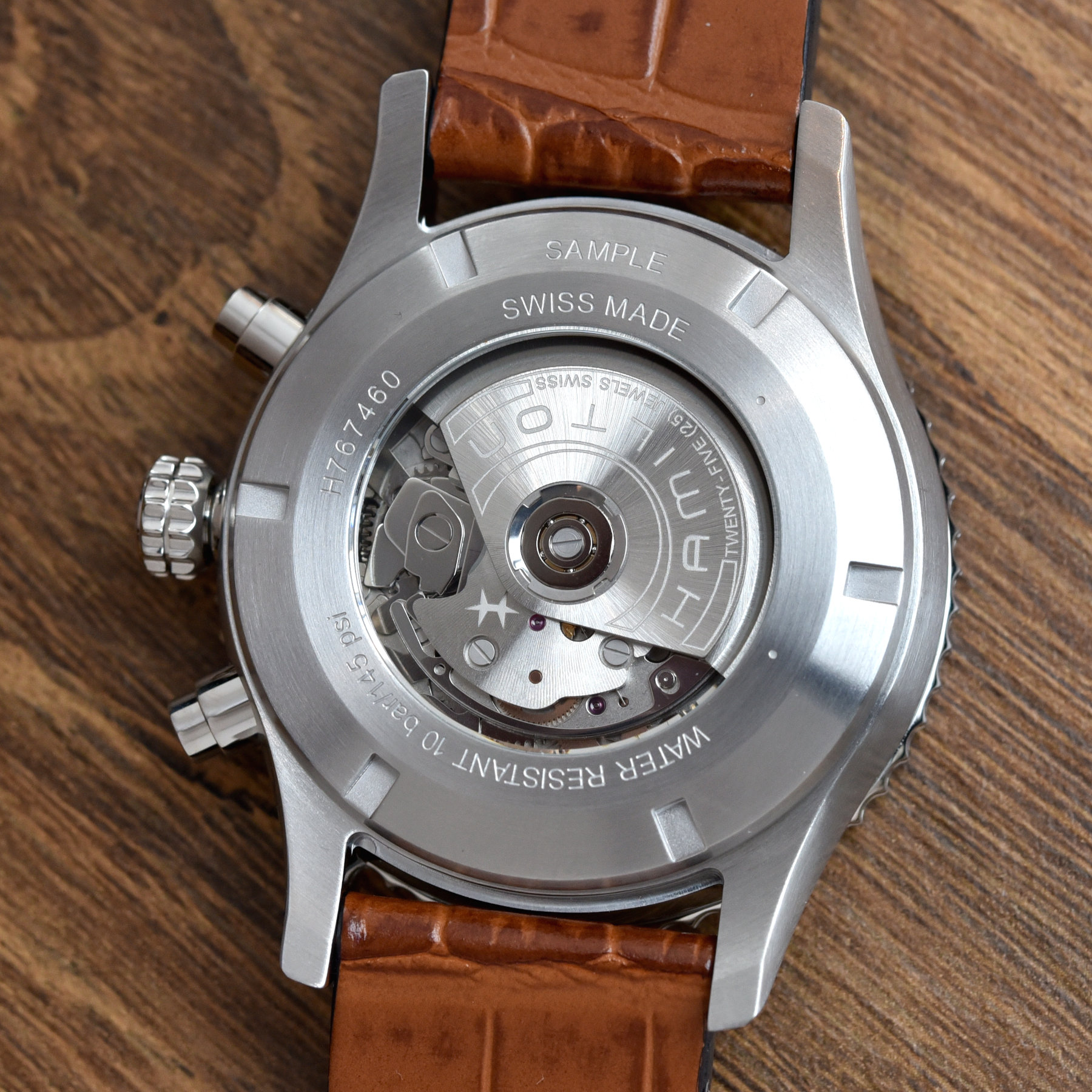 Quick Facts – 44mm x 14.60mm – stainless steel case, brushed & polished – bidirectional slide rule bezel – sapphire crystal front & back – 100m water-resistant – blue sunray brushed dial – hands & markers with Super-LumiNova – Calibre H-21-Si, automatic chronograph – 28,800vph – 60h power reserve – hours, minutes, small seconds, date, day of the week, chronograph – leather strap or stainless steel bracelet – EUR 2,245 (leather) – EUR 2,295 (bracelet)