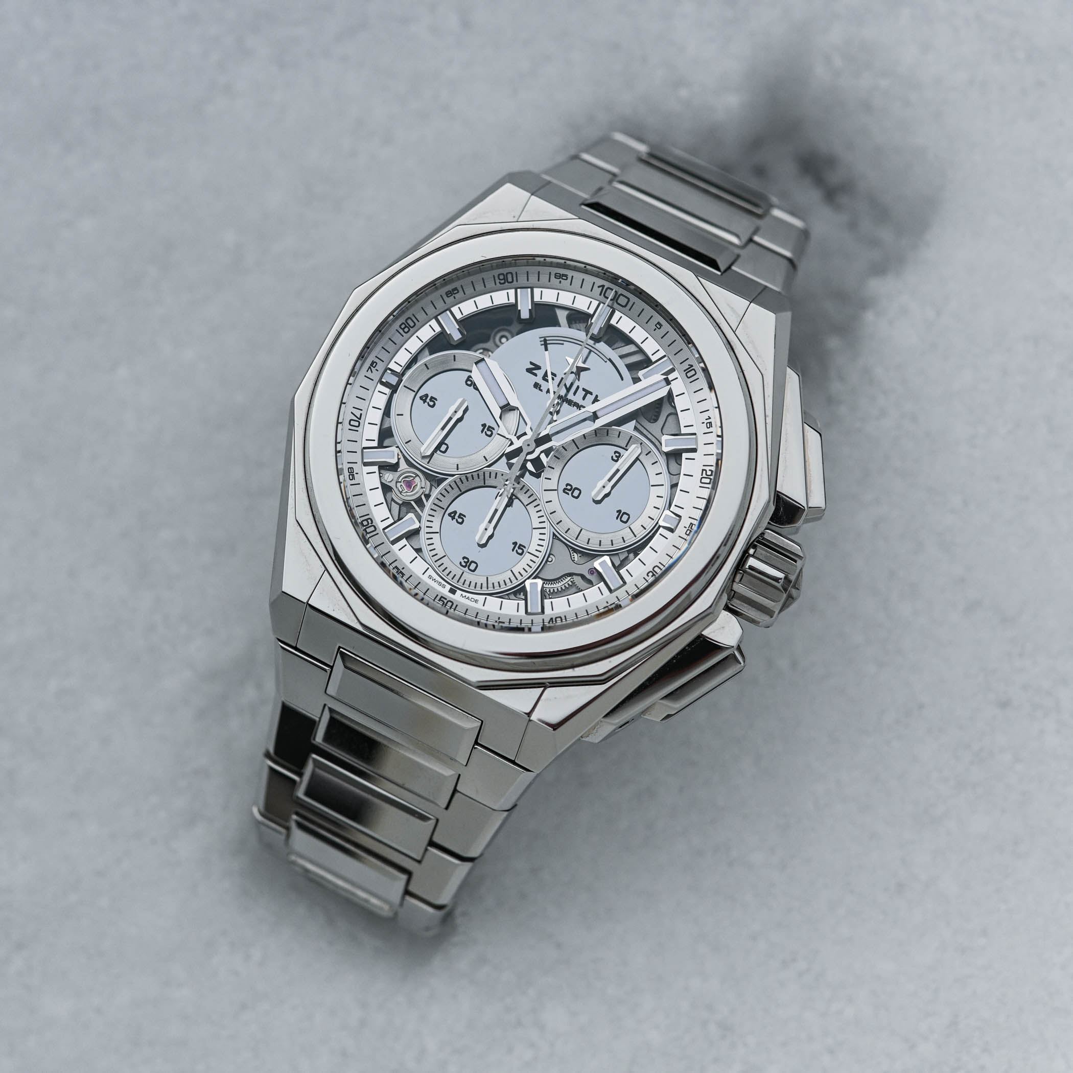 Quick Facts – 45mm x 15.4mm – stainless steel case, mirror-polished – 12-sided bezel, mirror-polished – sapphire crystal front & back – 200m water-resistant – openworked dial construction with sapphire crystal base – markers & hands with Super-LumiNova – El Primero 9004, in-house automatic chronograph – dual regulating organ (time; 36,000vph, chronograph; 360,000vph) – 50h power reserve – integrated bracelet, polished – non-limited edition – EUR 28,000