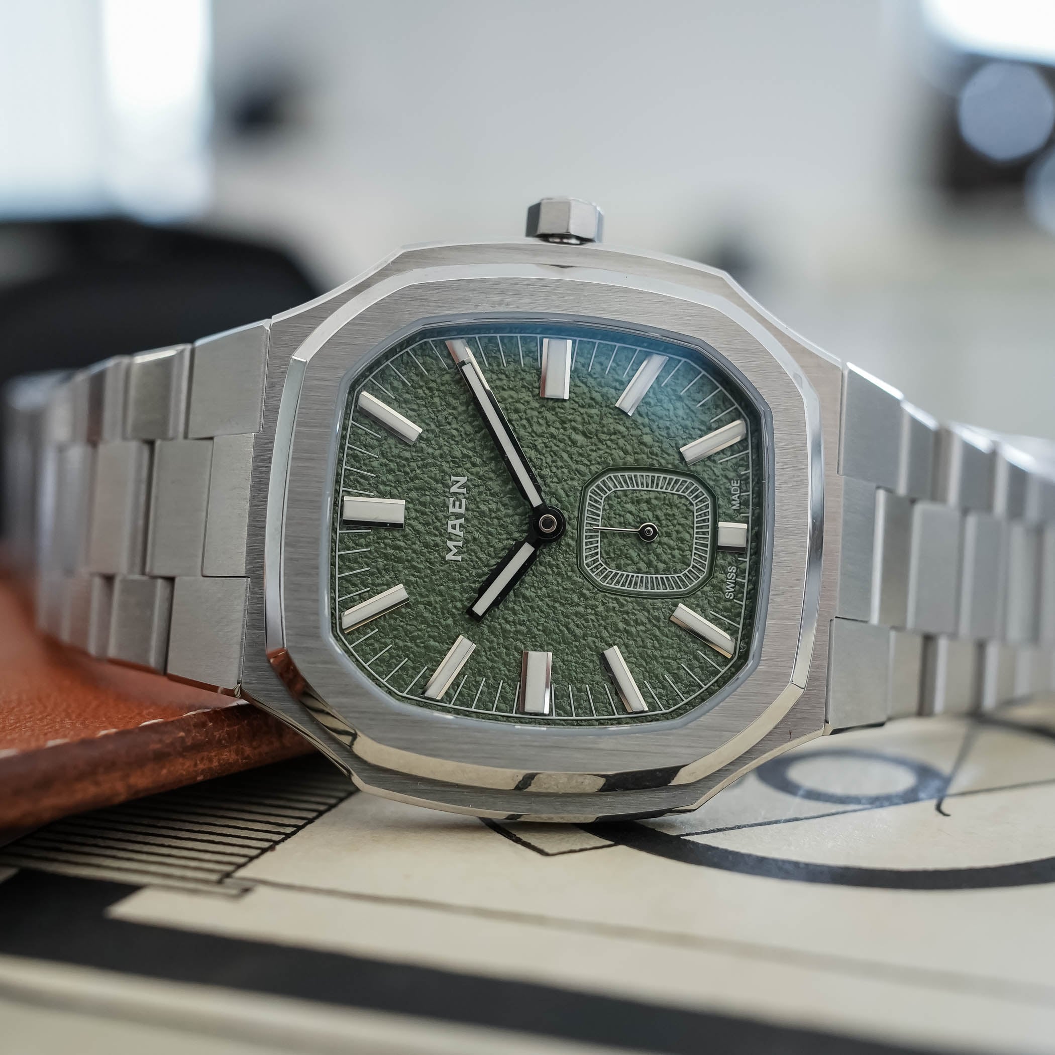 Something a little off the beaten path but no less sleek is Maen’s Manhattan 37 Ultra-Thin. It ticks all the right boxes, with a shaped case, faceted bezel and a crystal that follows the same profile, a textured dial, and a slim mechanical movement. Where the Manhattan 37 Ultra-Thin shines is the height of the case, which is an impressively slender 7.1mm! The green ‘Tuscan’ dial looks very tasty, and power comes from the hand-wound Peseux 7001. The three-link integrated bracelet completes the look perfectly. Admittedly, we go slightly over our self-imposed budget with this one, as it retails for EUR 1,159 excl. VAT, but it’s still a solid deal!