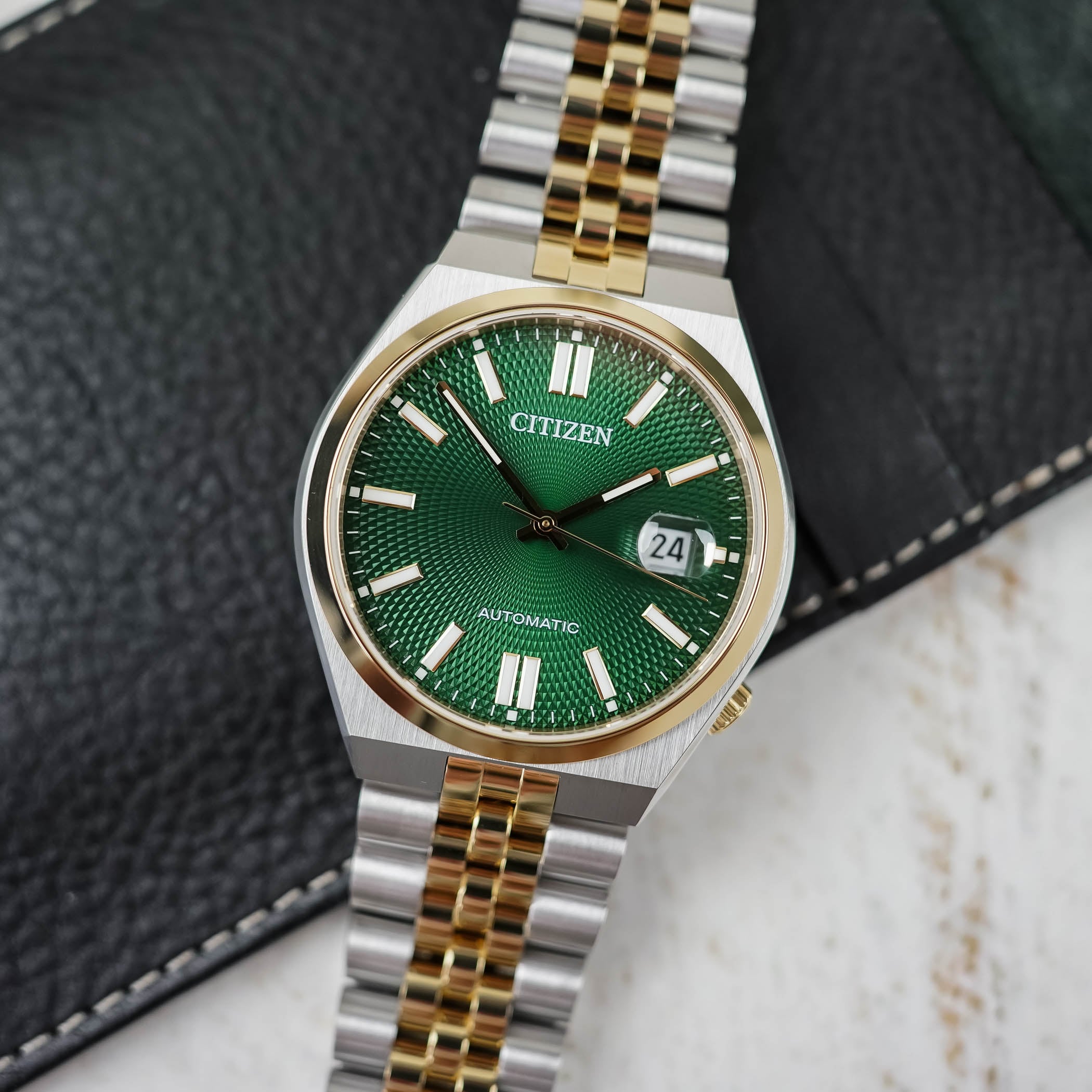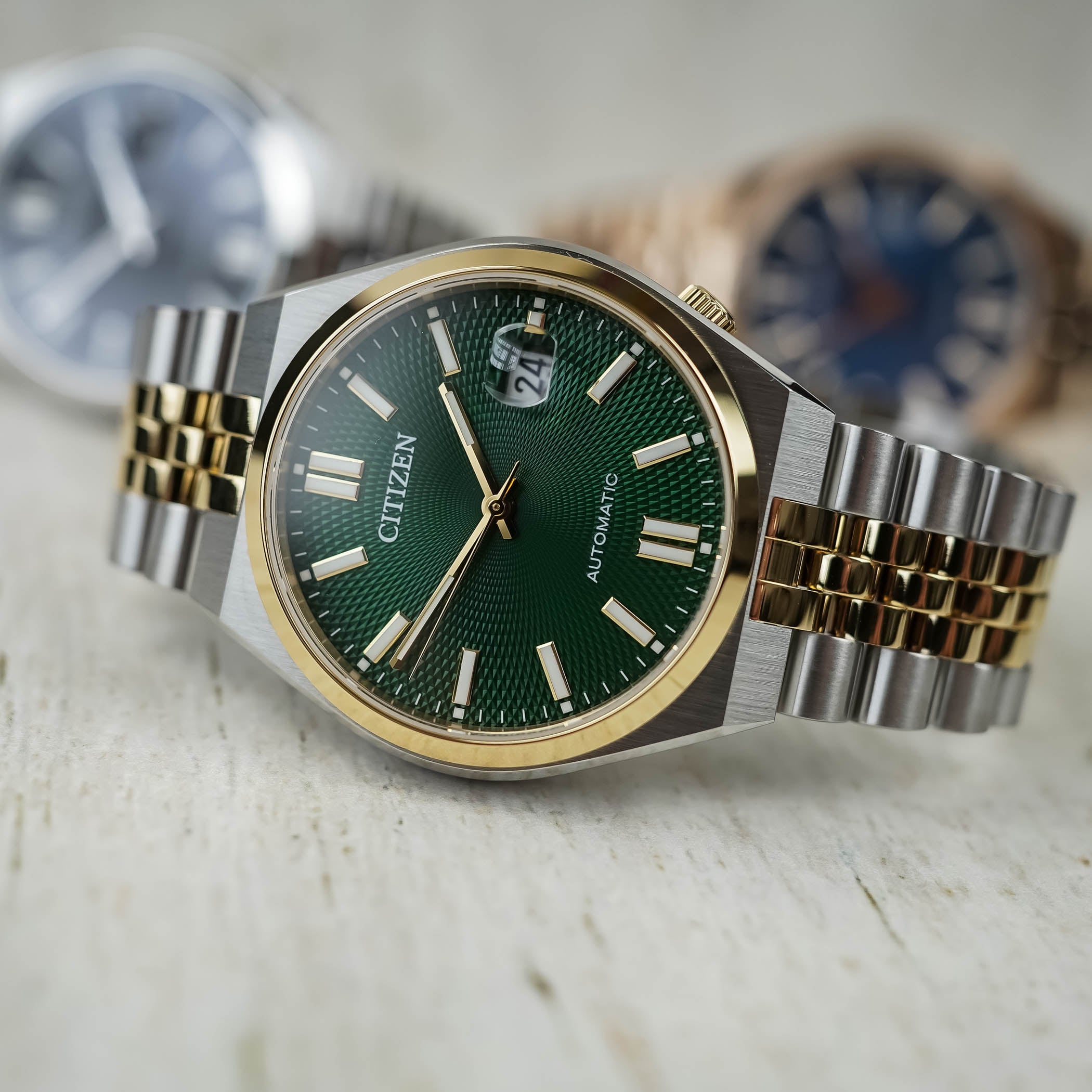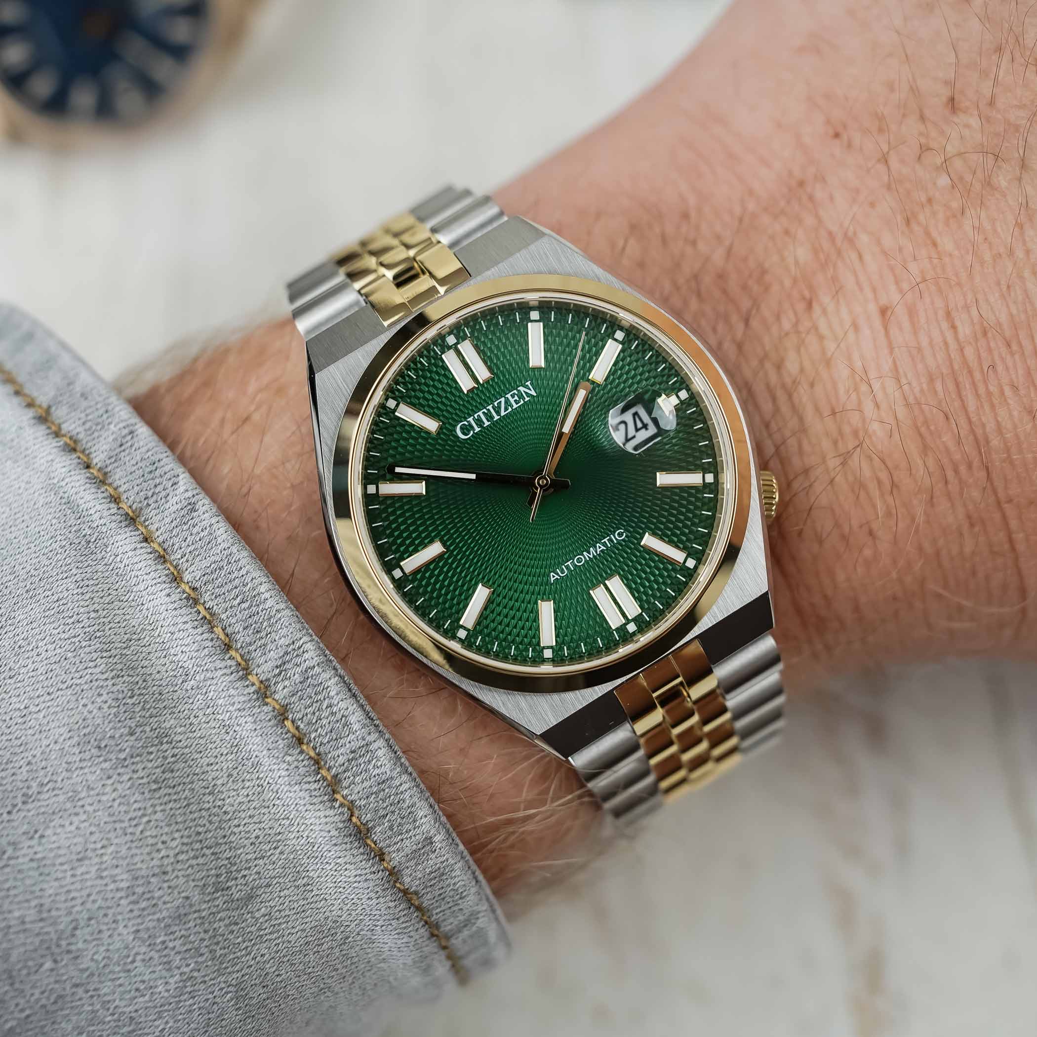 Quick Facts – 40mm x 11.7mm – 45mm lug-to-lug – stainless steel case, brushed & polished – yellow-gold IP-coated crown & bezel – sapphire crystal with cyclops – mineral crystal caseback – 50m water-resistant – stamped green dial – applied markers & hands, luminous – Calibre 8310, automatic – 21,600vph – 60h power reserve – integrated steel multi-link bracelet with yellow gold IP-coated centre links – concealed butterfly folding clasp – EUR 429