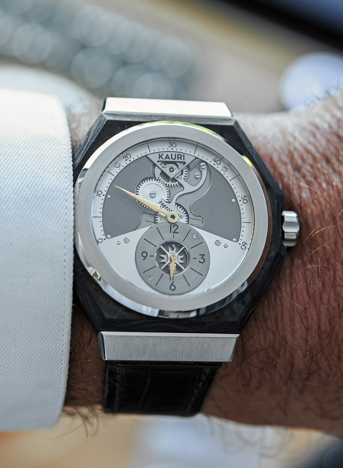 Carbon isn’t just reserved for mainstream manufacturers, but independent watchmakers every now and then know their way around the material as well. Take Kauri for instance, which uses it in the refreshing Régulateur Carbone. The 8-sided case is constructed out of steel and Carbonium, a type of forged carbon. As its name suggests, it has a regulator-style display for the hours (which jump, in the subdial at 6′), and the minutes, displayed with a hand in the centre. The base movement is made by Olivier Mory, but the module on top is made in-house. Only 20 will be made, all on subscription, with a price of CHF 34,000.