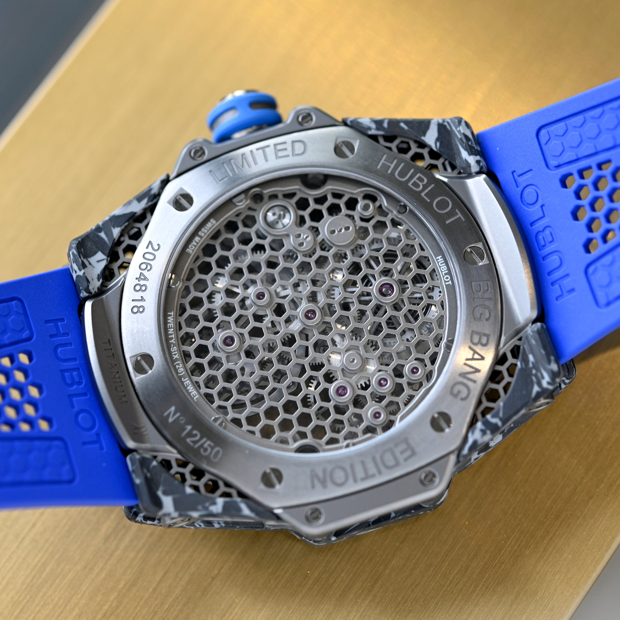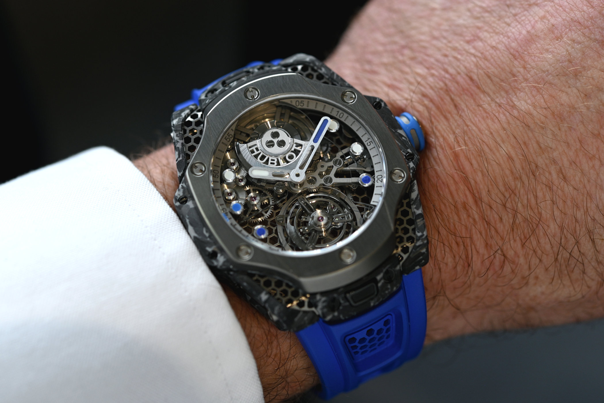 Quick Facts – 44mm x 13.75mm – titanium & forged carbon case – honeycomb structures throughout – sapphire crstal front & back – 30m water-resistant – openworked dial – applied markers & hands with SLN – Calibre HUB6035, in-house micro-rotor automatic – 21,600vph – 72h power reserve – honeycomb baseplate – flying tourbillon escapement – integrated blue rubber strap with honeycomb sections – titanium folding clasp – limited edition of 50 pieces – EUR 149,000