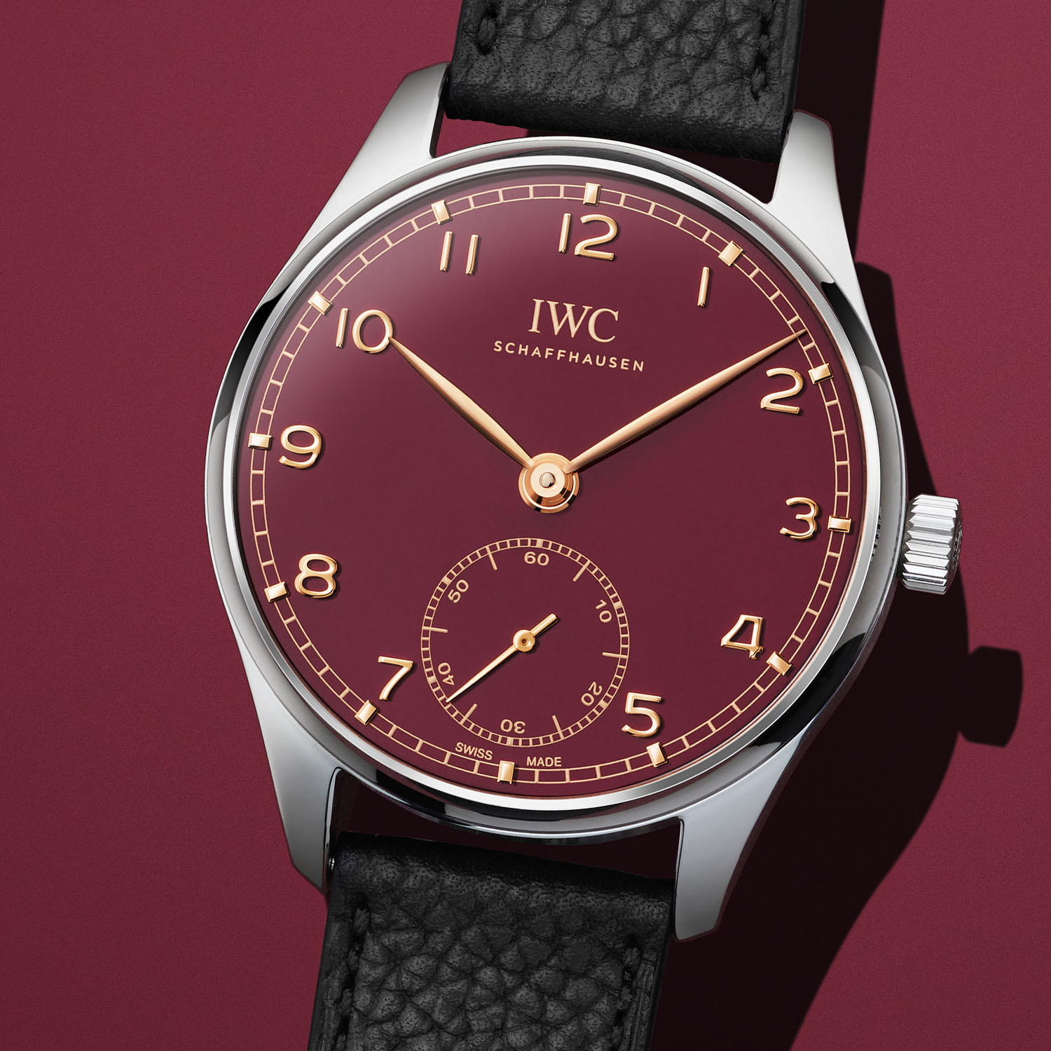 Quick Facts – 40.4mm x 12.4mm – stainless steel case, brushed & polished – sapphire crystal front and back – burgundy-red dial with gold-plated indices and hands – IWC calibre 82200, manufacture – automatic movement with Pellaton winding system – 31 jewels – 28,800vph – 60h power reserve – hours, minutes, small seconds – black leather strap – IW358315 – limited edition of 500 pieces – EUR 8,650