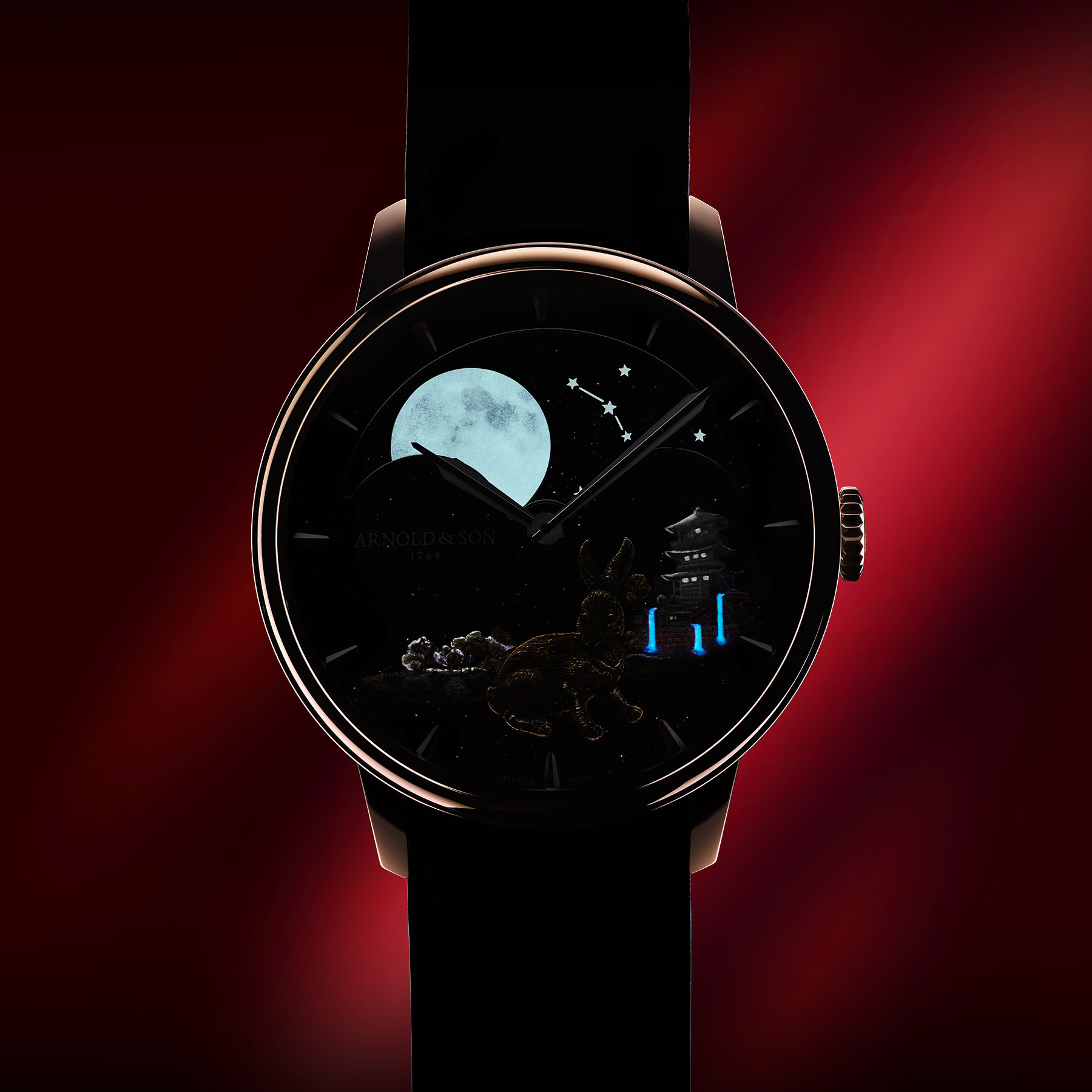 Arnold & Son also stepped up and presents an intriguing watch dedicated to the Chinese Lunar New Year, with the Perpetual Moon Year of the Rabbit. Dresses in an 18k rose gold case, the oversized luminescent moonphase moves across a black aventurine background. In the lower half, a hand-engraved rabbit is applied, nestled in between foliage and in front of a traditional Chinese pagoda. Elements of the dial have been treated with Super-LumiNova, which makes for quite the spectacle at night. The manual wound Calibre A&S1512 can be seen through the caseback, with an additional moon phase indication for precise setting if needed. Worn on a black alligator strap with a rose gold pin buckle, it is limited to 8 pieces and costs CHF 57,000.