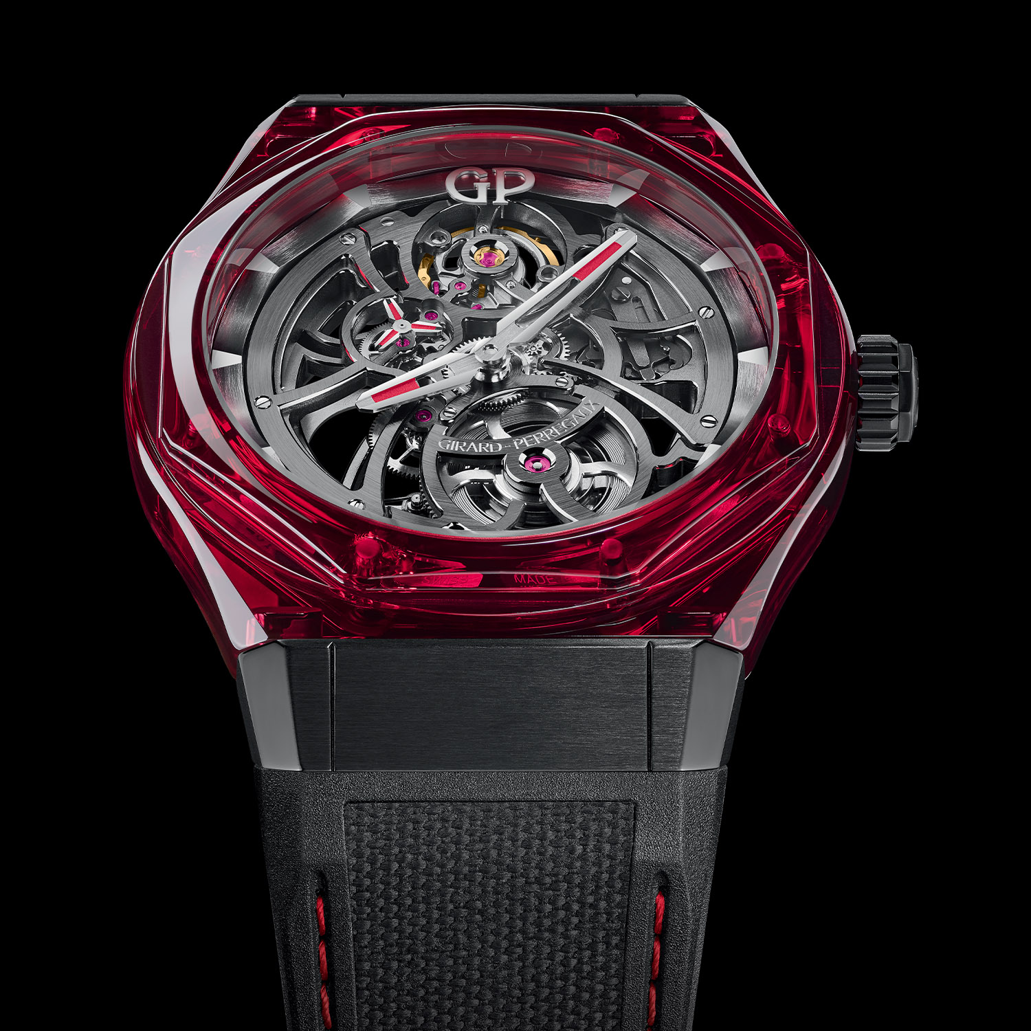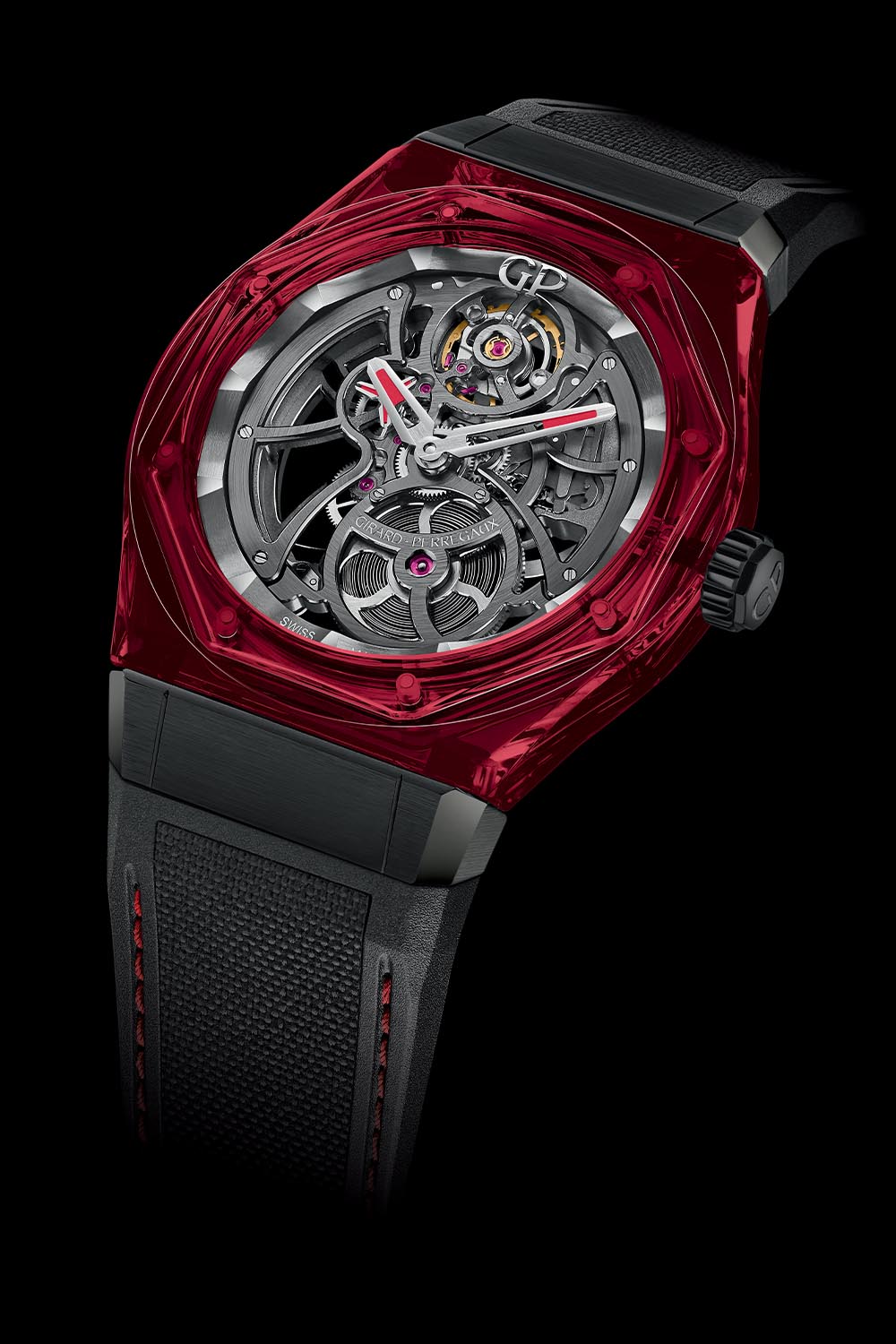 Quick Facts – 44mm x 11.56mm – red polycrystalline YAG case – black PVD-coated titanium lugs and crown – octagonal bezel with 8 screws – sapphire crystal front and back – openworked NAC-treated bridges and octagonal mainplate – skeletonised hour and minute hands – small seconds – polished triangular indices – exposed barrel and balance wheel – calibre GP01800-1143, in-house – 25 jewels – 28,800vph – 54h power reserve – black rubber strap with fabric effect and folding buckle – limited to 18 pieces – CHF 95,000