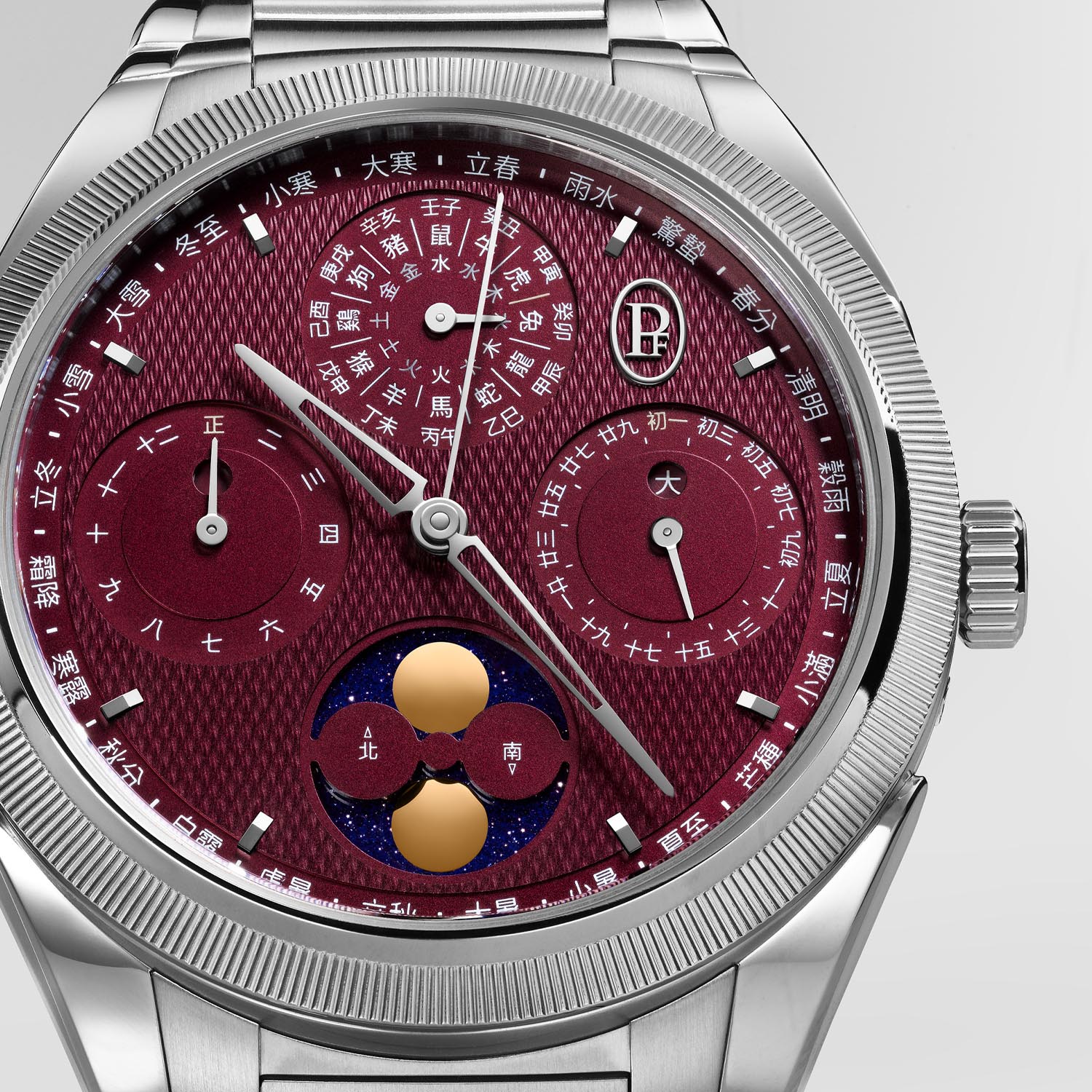 Quick Facts – 42mm x 12.2mm – stainless steel case with knurled platinum bezel – sapphire crystal front and back – Imperial Red dial with barleycorn guilloché pattern – rhodium-plated gold hands and appliques – indications with the name of the year, animal and element, number of day, long or short month, moon phase, month number and an indication of the intercalary month, and solar terms – calibre PF008, in-house – automatic winding – 42 jewels – 28,800vph – 54h power reserve – integrated stainless steel bracelet – CHF 59,000