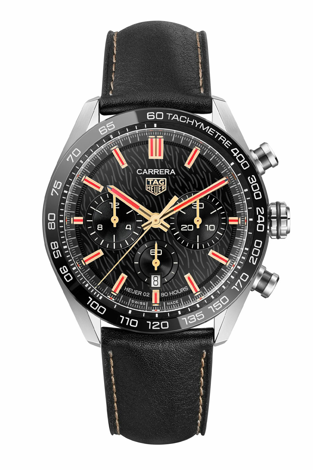 Quick Facts – 44mm diameter – stainless steel case – fixed ceramic tachymeter bezel – domed sapphire crystal – sapphire crystal caseback with red rabbit motif – black dial with printed waves – snailed chronograph sub-dials – rose gold-plated hands and applied indices – red lacquer and lume details – calibre Heuer 02, in-house – automatic integrated chronograph with column wheel and vertical clutch – 33 jewels – 28,800vph – 80h power reserve – hours, minutes, chronograph with 30-minutes and 12-hours, small seconds, date – black leather strap with folding clasp – limited edition of 500 pieces – EUR 6,750